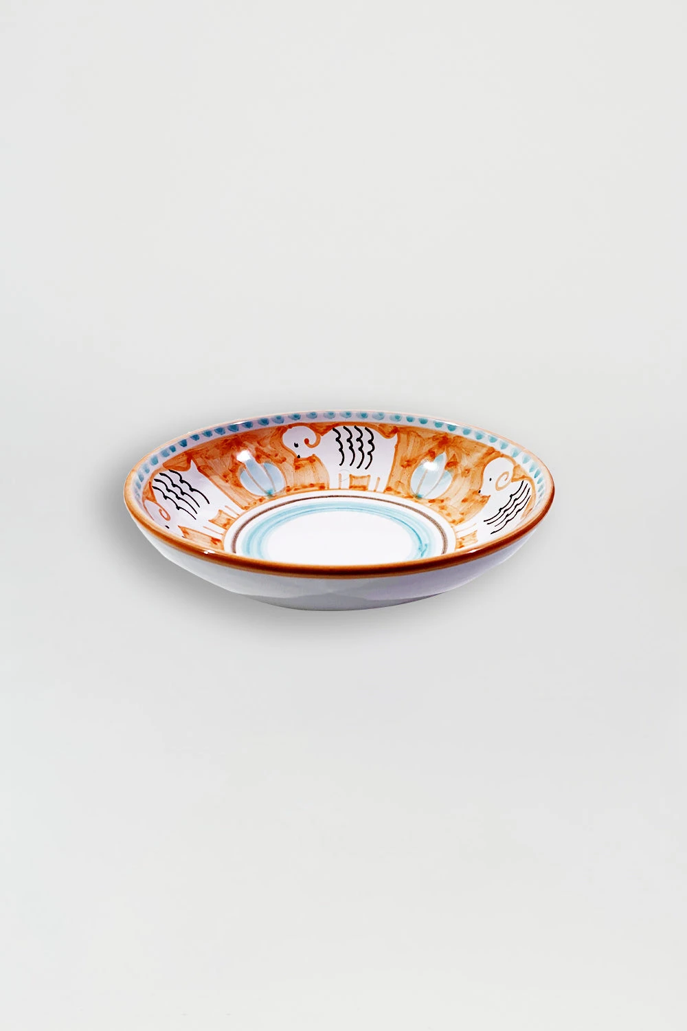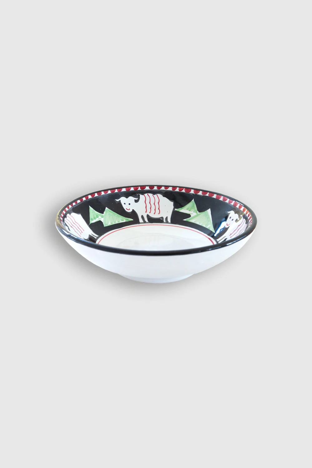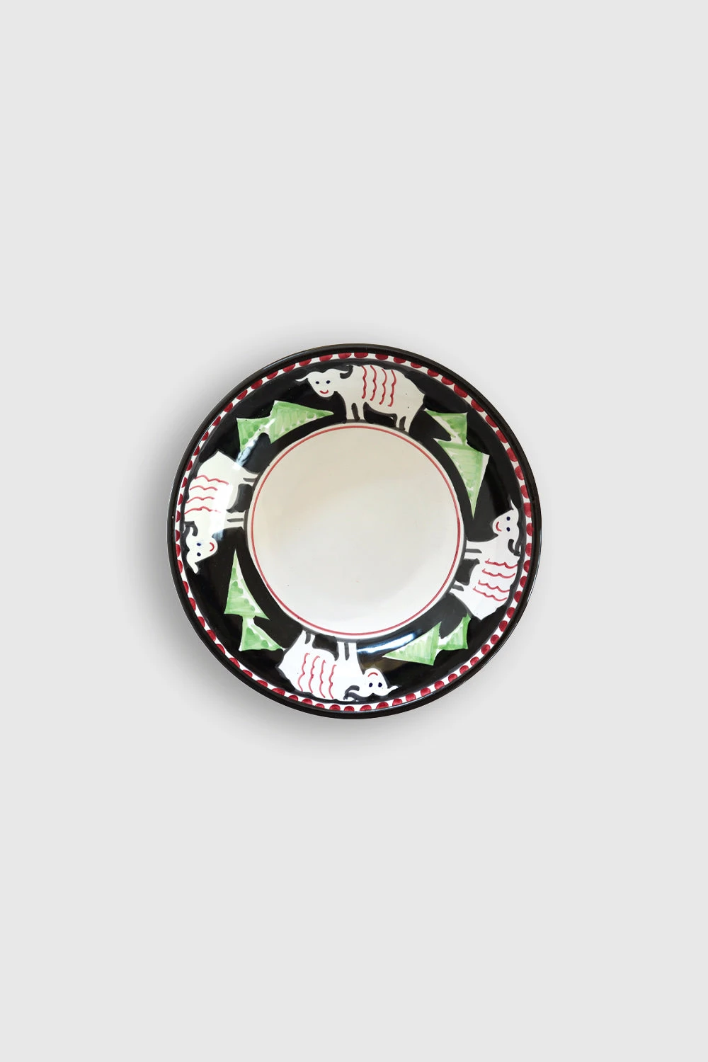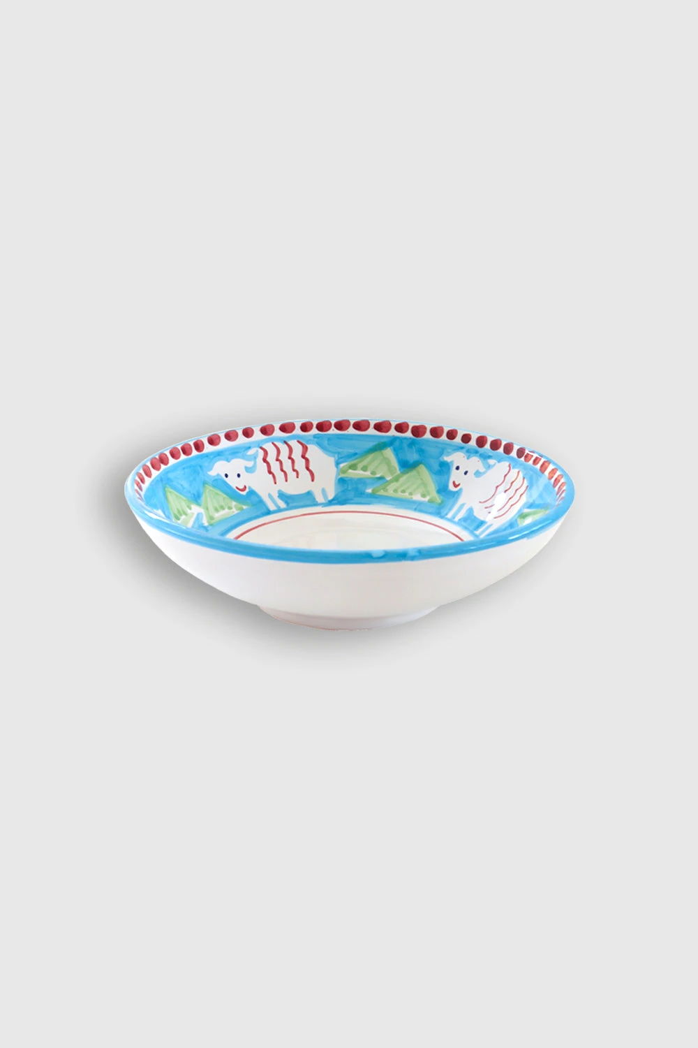 Assiette creuse en céramique avec motifs Moutons, parfaite pour vos plats de pâtes en sauce ou vos soupes. Chaque pièce unique est fabriquée par des artisans italiens et décorée au pinceau sur la base de tons aquarellés et de thèmes bestiaires porte-bonheur.