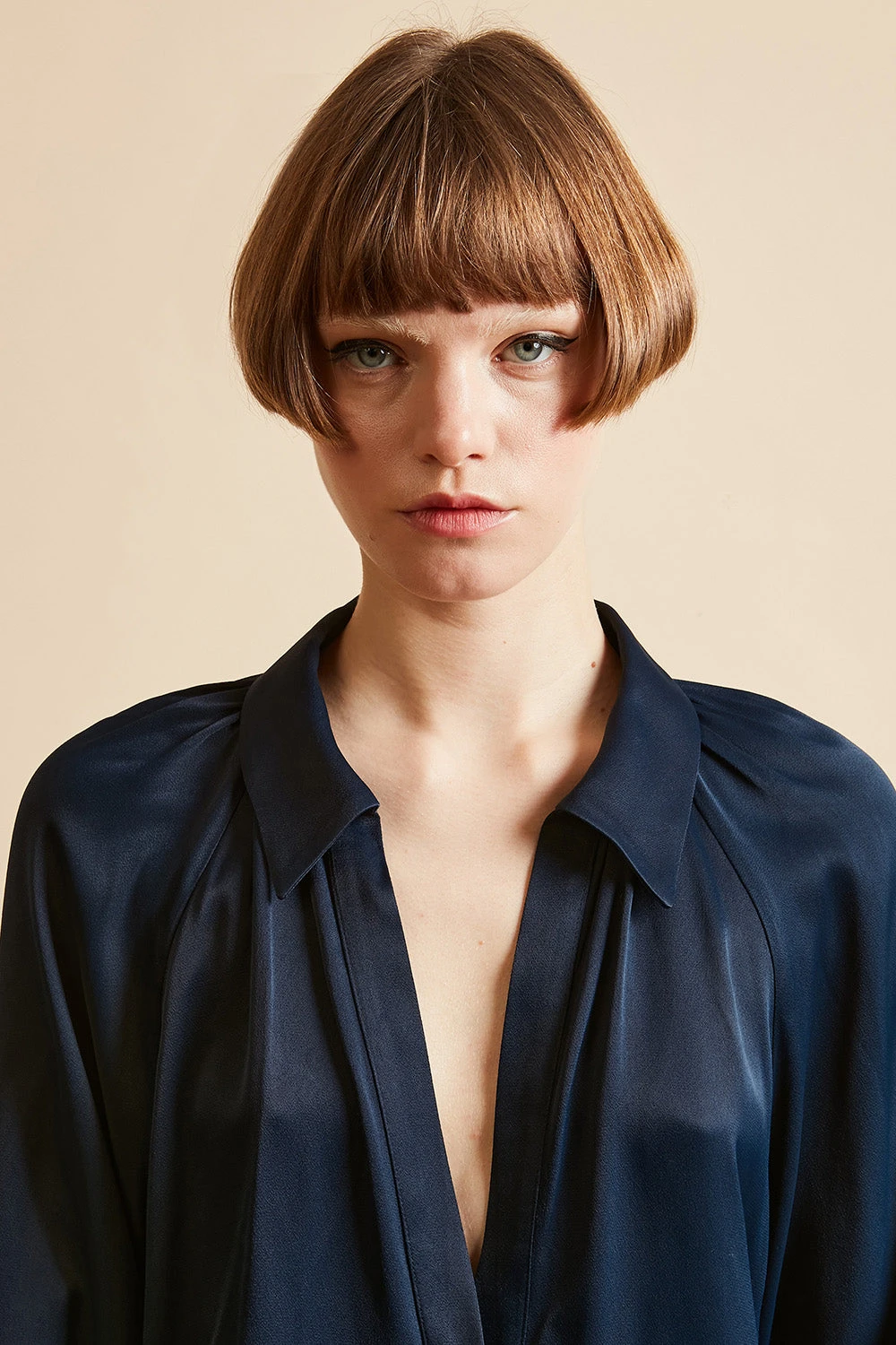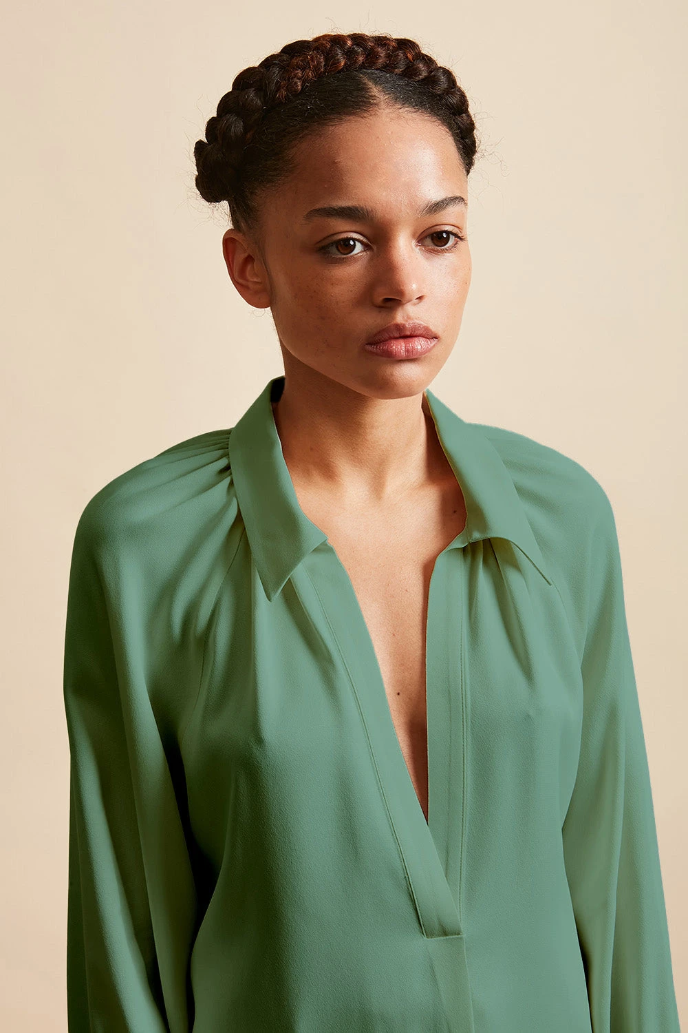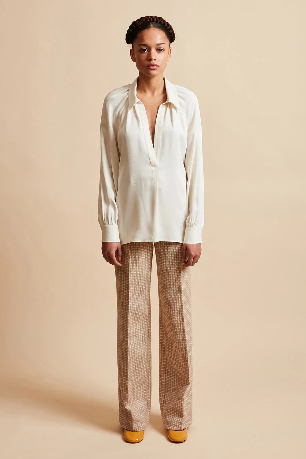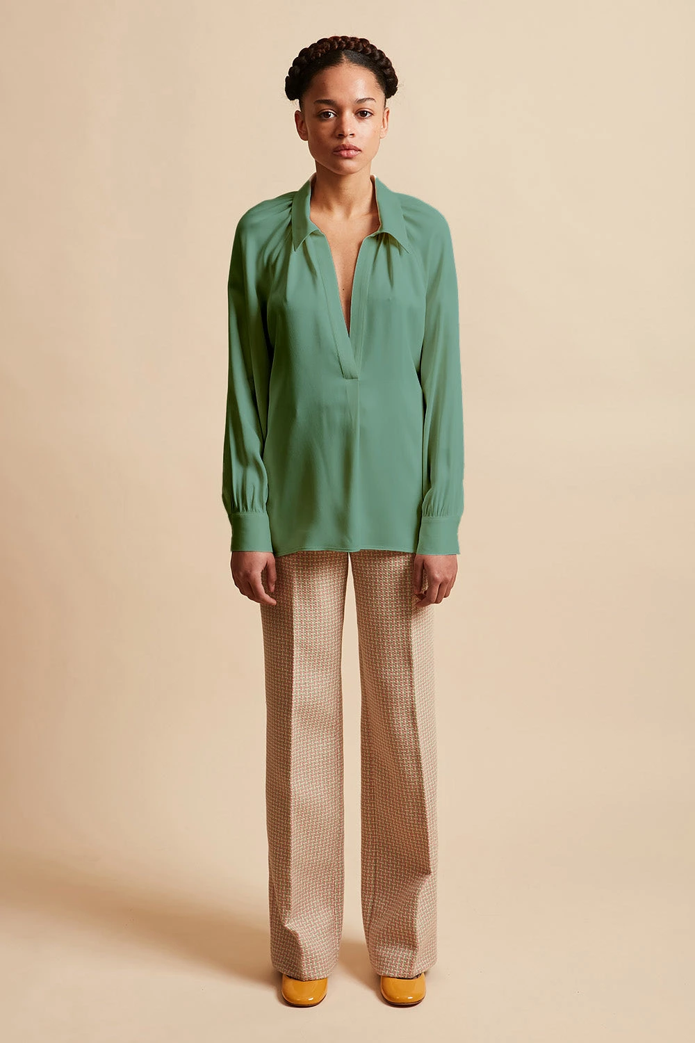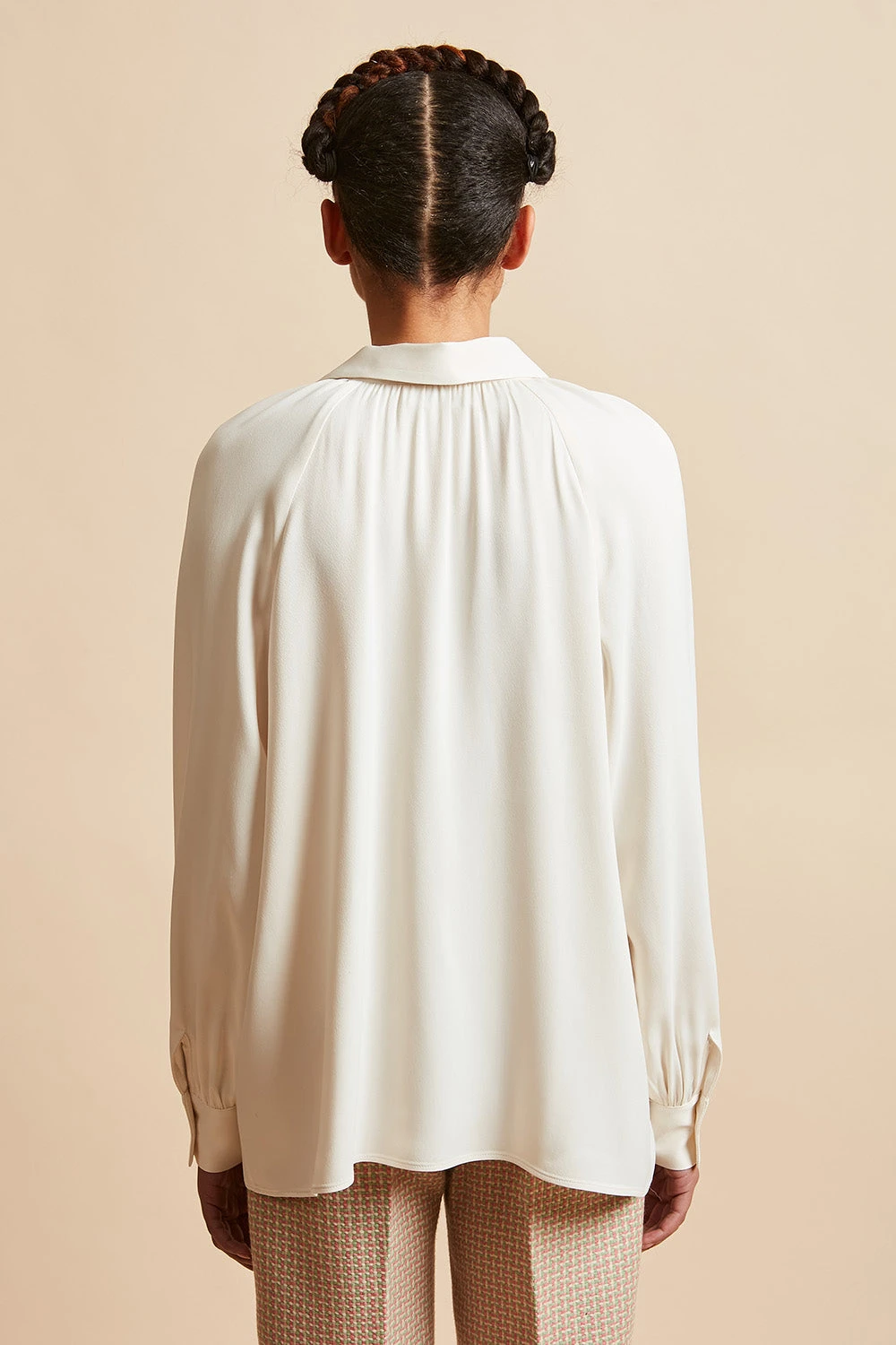 La blouse en crêpe envers satin PASSION est un intemporel à avoir dans son dressing. Confectionnée à partir d’un tissu italien, elle dispose d’un col chemisier, d’une patte polo sans boutonnage et d’un pli plat en bas de la patte polo. L’encolure est froncée tout autour et elle est dotée de manches raglan froncées. Les poignets se ferment par deux boutons en nacre. L’assemblage intérieur est réalisé en couture anglaise.