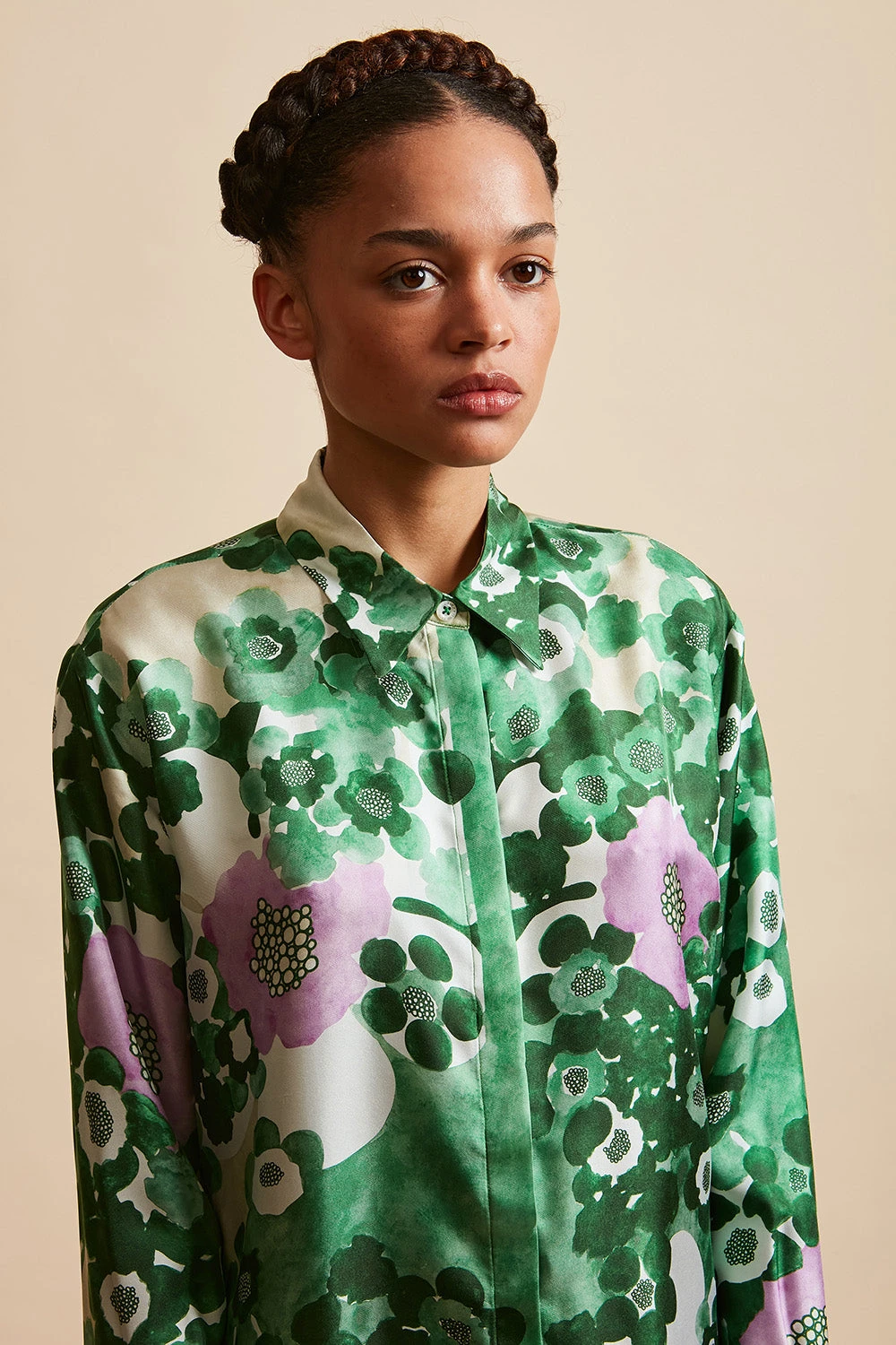 Succombez pour la chemise GINA en twill de soie imprimé à motif floral. Elle est dotée d’un col chemise, d’une patte de boutonnage à l’avant et de boutons nacre.