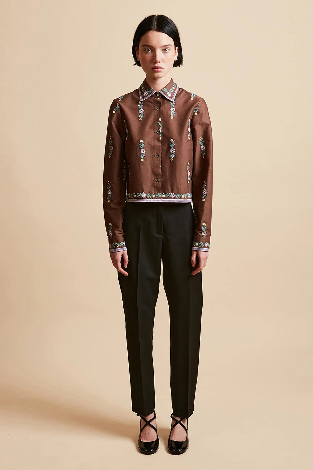 Craquez pour le chemisier court MARLY court en batiste de coton bordé. Sa broderie floral, son tissu français, son col chemisier avec pied de col boutonné, ses manches longues avec 2 plis au montage poignet patte capucin lui donnent un style tout particulier.