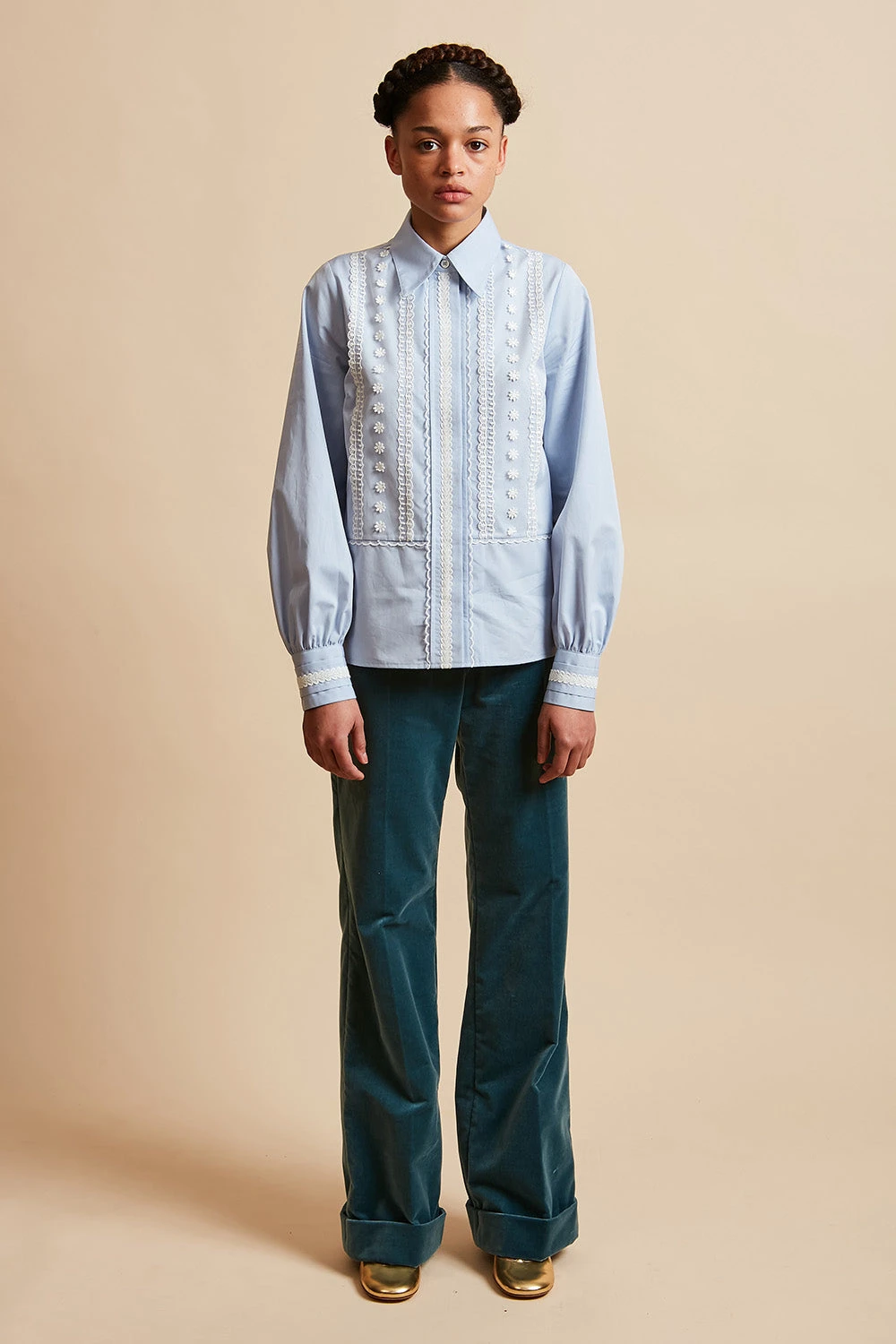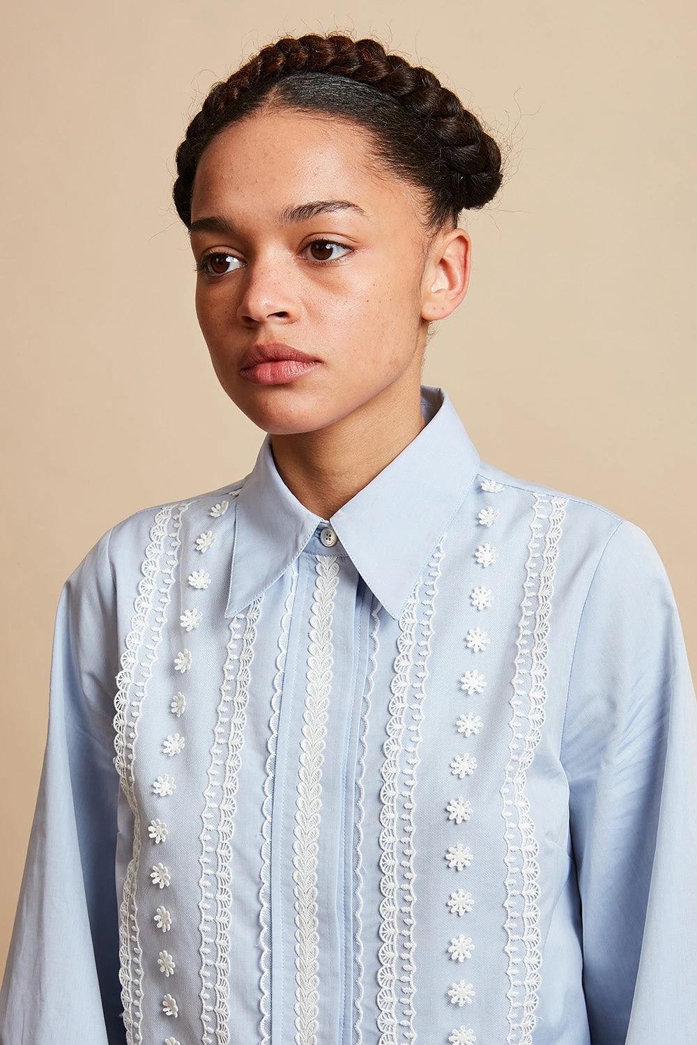 Complétez votre garde-robe avec le chemisier manches longues en popeline de coton COLETTE. Orné dans sa longueur de galons et de festons en dentelle, il dispose d’une découpe horizontale sous la taille. Il est doté de fronces, d’un galon et d’une boutonnière aux poignets.