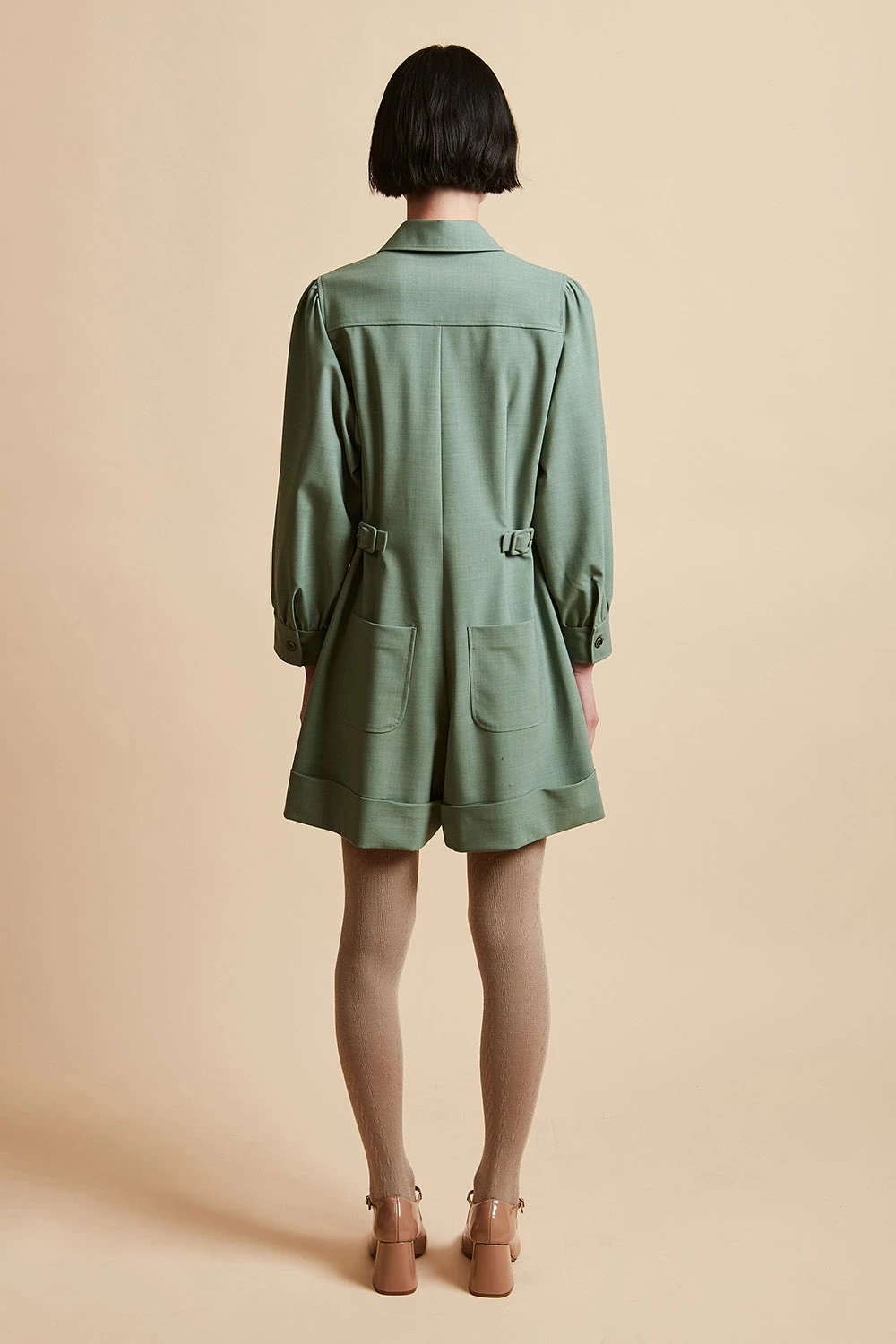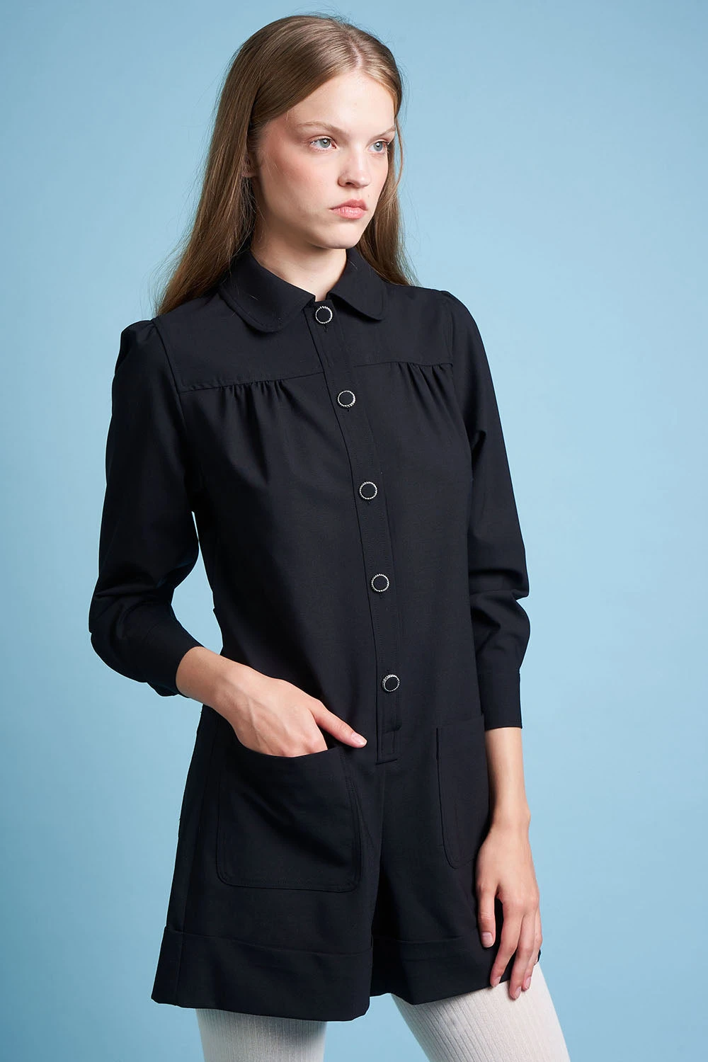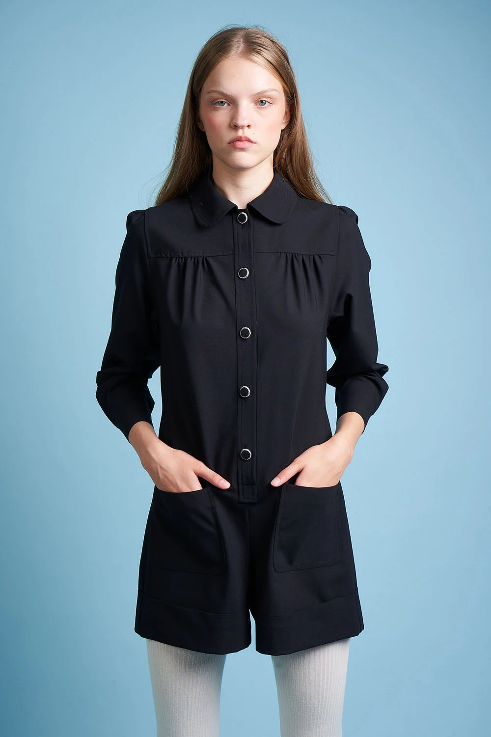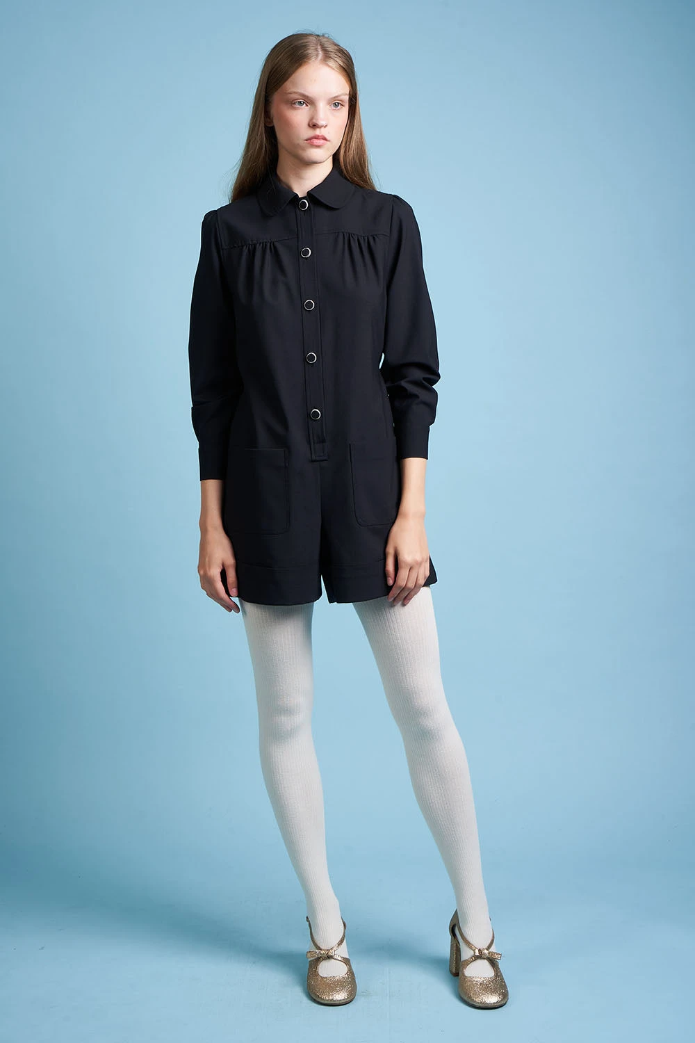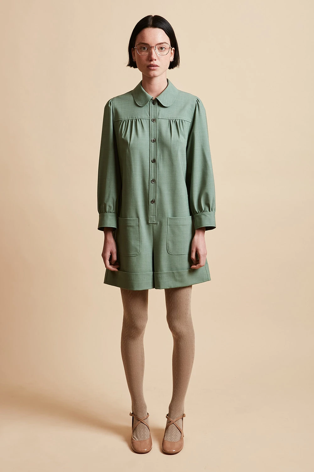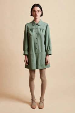 Complétez votre garde robe avec la combi-short en laine vierge tropicale tissée en Italie MARMOT. Elle dispose d’un col arrondi avec banane, d’un empiècement aux épaules avec frondes et d’une patte polo ornée de boutons nacre. Elle est également dotée de paires de poches plaquées à l’avant et au dos et de manches 3/4 avec fronces. Des boucles de serrage recouvertes sont présentes à la taille.