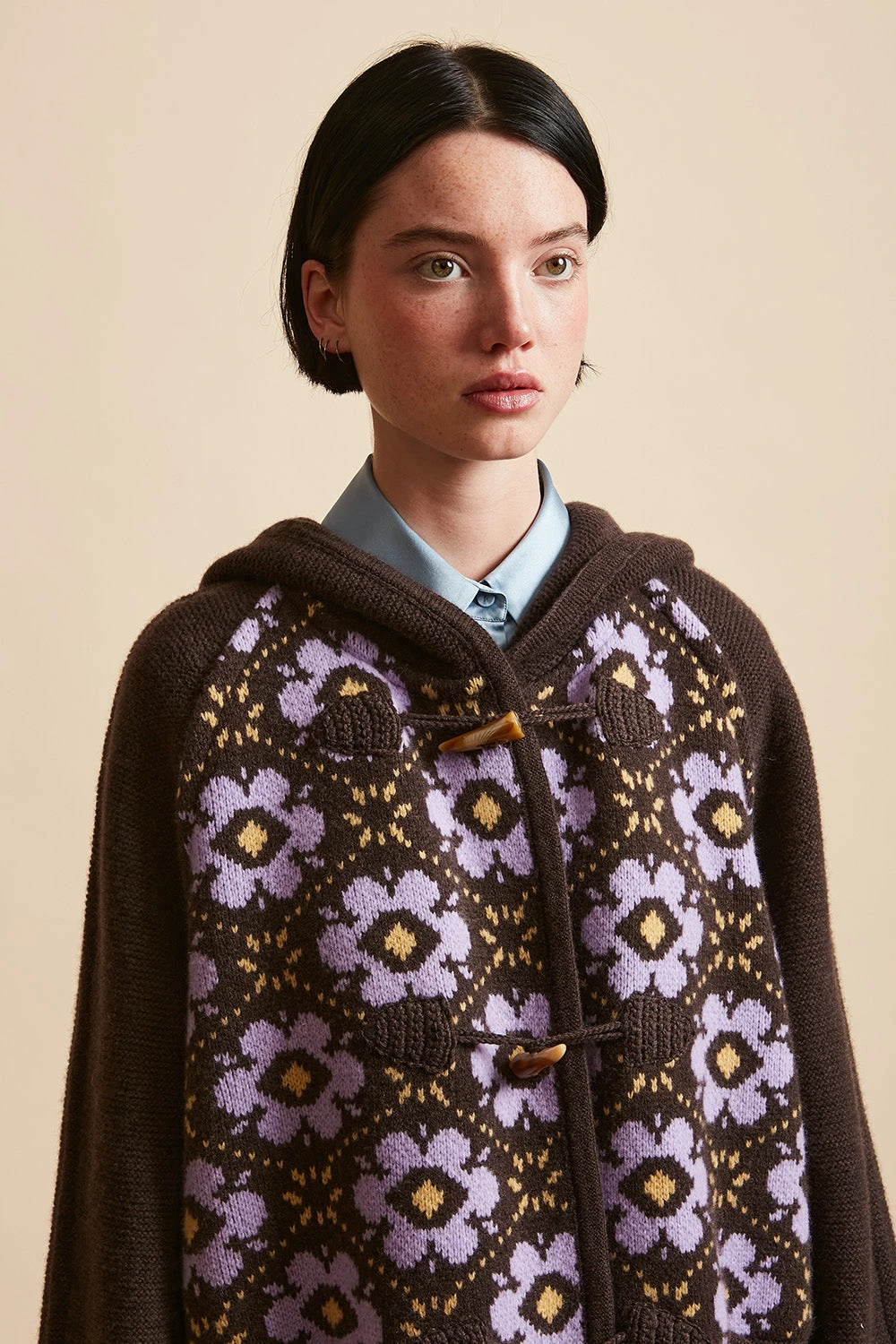 Complétez votre dressing avec le duffle coat en maille jacquard à motif floral all over PRUSSE. Il dispose de deux poches sur l’avant et d’une capuche et de manches en points mousses unis. Il est doté d’une fermeture à l’avant avec des bandes bourges en crochet et corne.