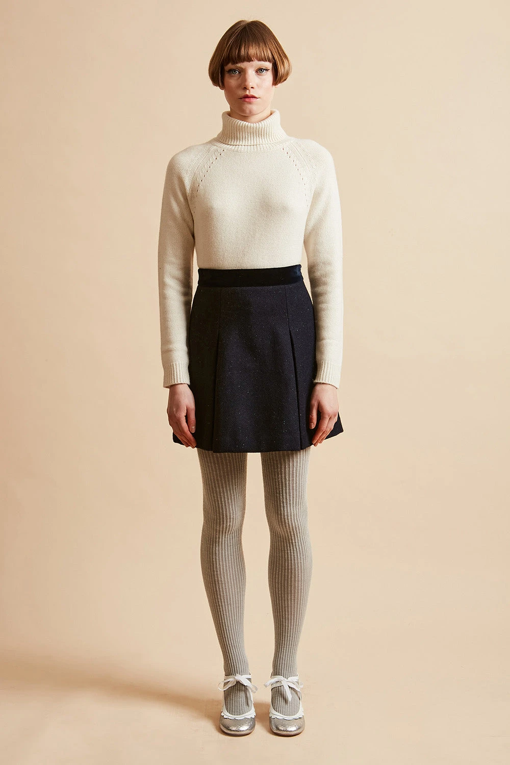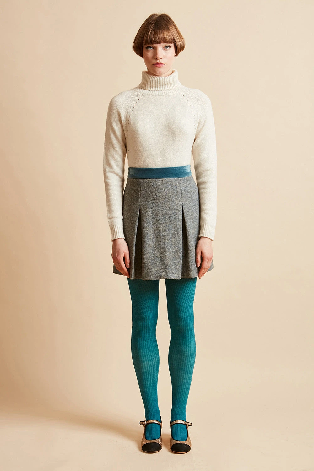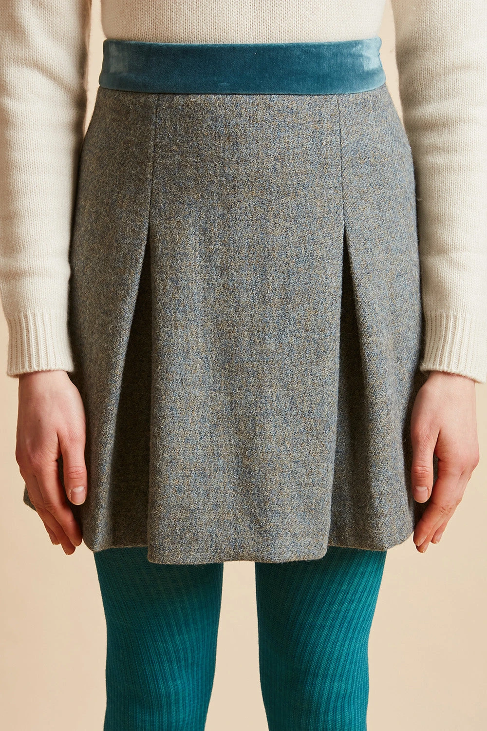 Succombez à la jupe courte en tweed de laine vierge Harris Tweed HANAE. Elle dispose d’une ceinture en velours de coton et de deux plis creux sur le devant. Elle se ferme par un zip invisible sur le côté.