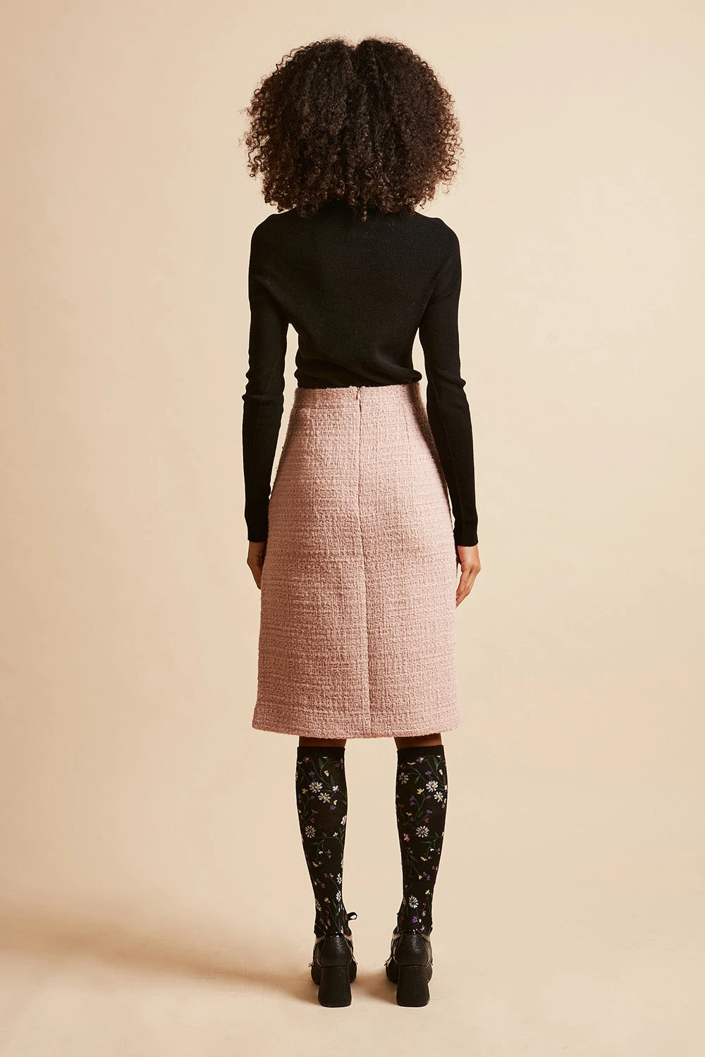 Succombez au tweed de laine lurex avec la jupe droite taille haute KIM. Elle dispose d’une fente sur le côté devant ornée d’un galon noir ennobli de petits noeuds. De longueur genoux, elle se ferme grâce à une fermeture zip sur le côté.