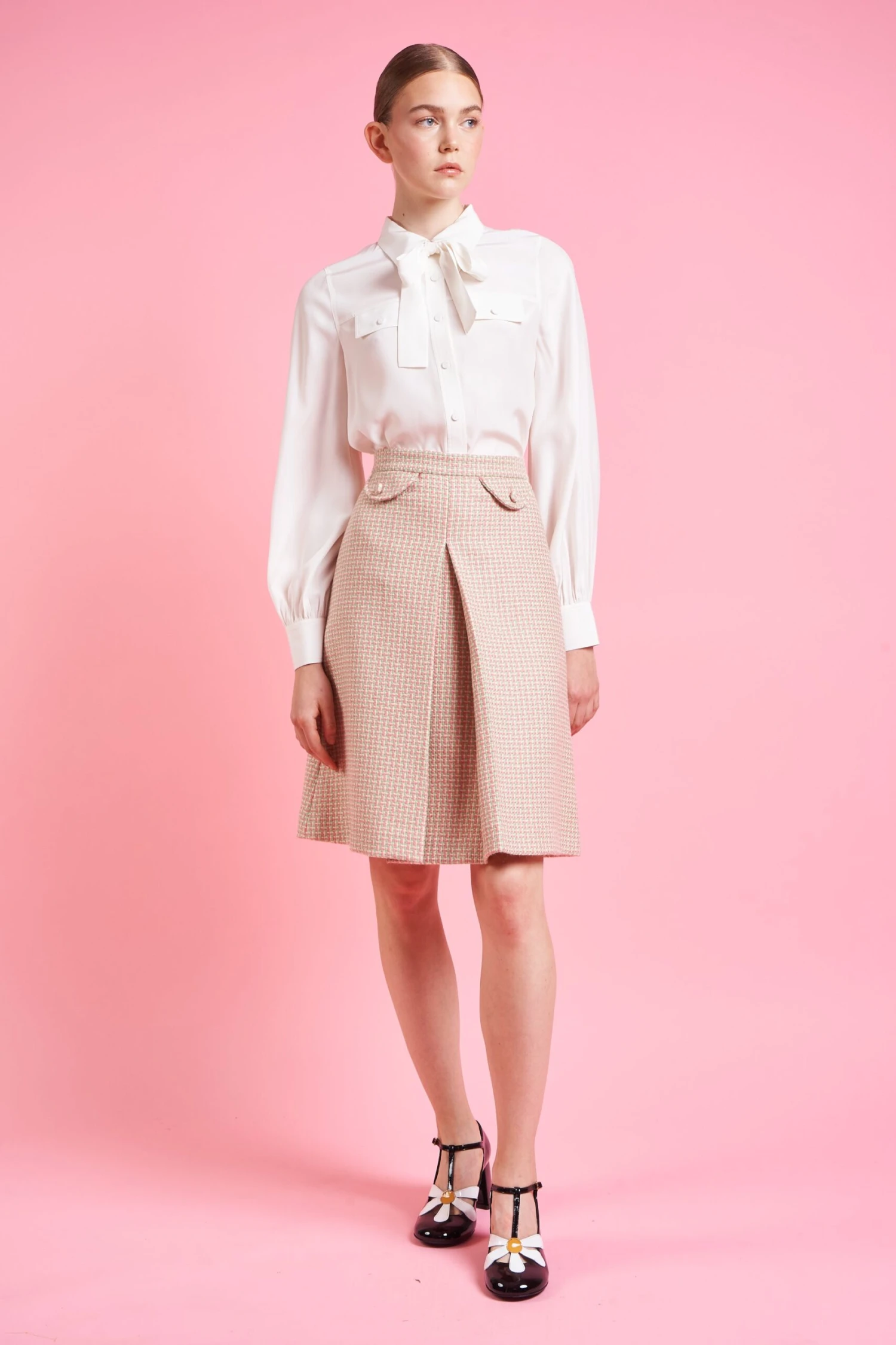 Complétez votre garde robe avec la jupe en tweed tricolore de mohair et laine tissée JEANETTE. Elle dispose d’un pli creux à l’avant et d’une paire de poches à rabats avec boutons pions recouverts prises dans la couture à la taille. Elle est également dotée de surpiqures au fil cordonnet et d’un zip invisible à l’arrière. La jupe est doublée.