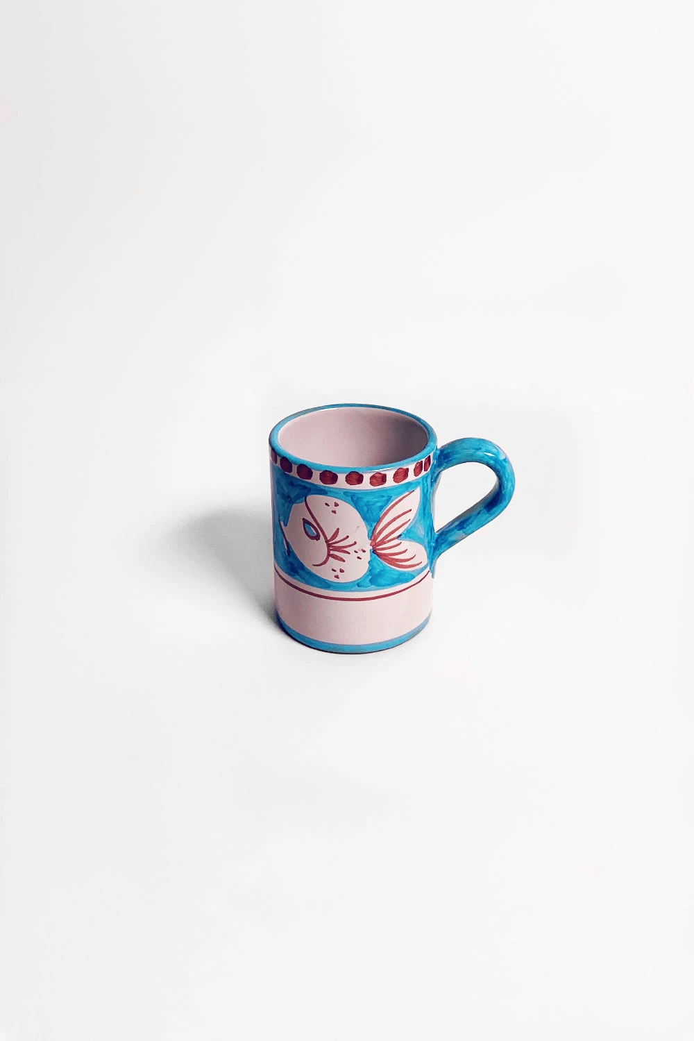 Mug en céramique avec motifs Poissons. Chaque pièce unique est fabriquée par des artisans italiens et décorée au pinceau sur la base de tons aquarellés et de thèmes bestiaires porte-bonheur.