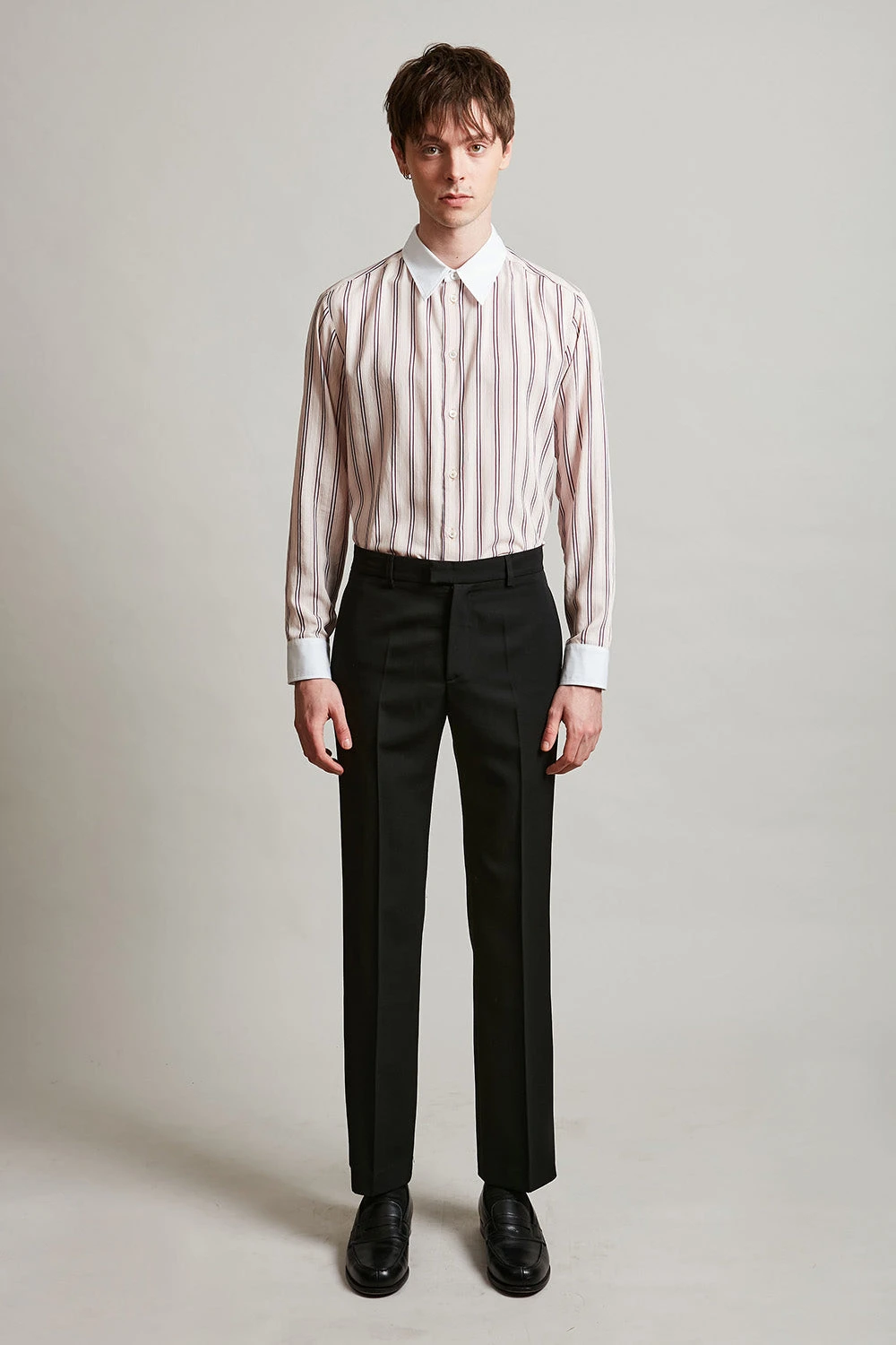 Ajoutez une touche d’élégance à votre tenue avec le pantalon en grain de poudre de laine vierge tissée en Italie BRUNO. De coupe droite, il dispose de plis marqués et d’une insertion de bande en satin duchesse le long de la couture côté. Il est également doté d’une paire de poches italiennes sur les côtés et d’une paire de poches à double passepoil boutonnées au dos. Le pantalon a des passants afin de pouvoir ajouter une ceinture.