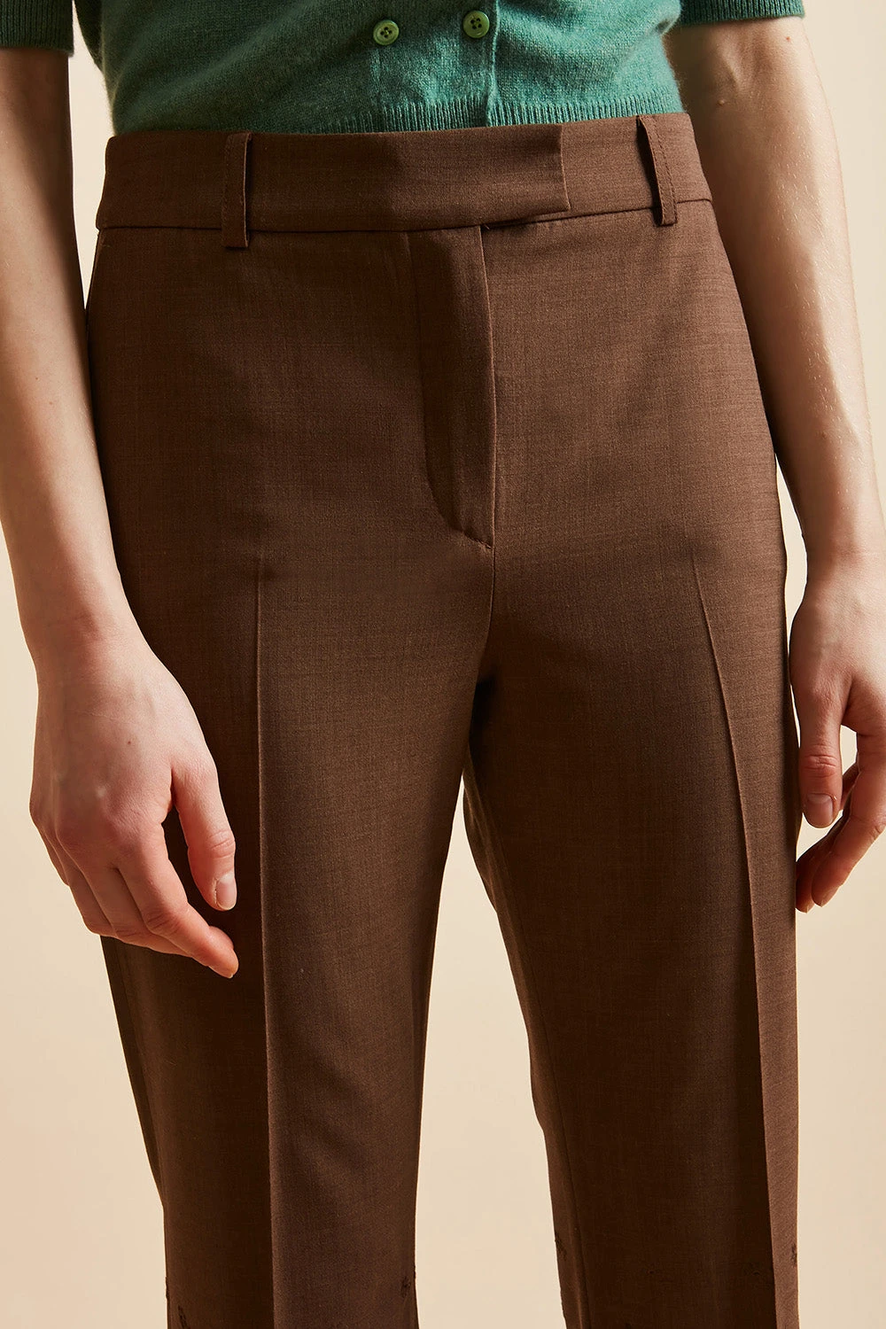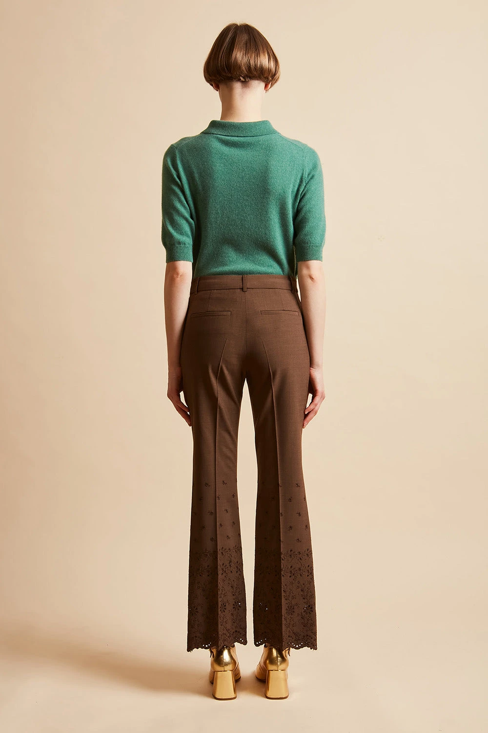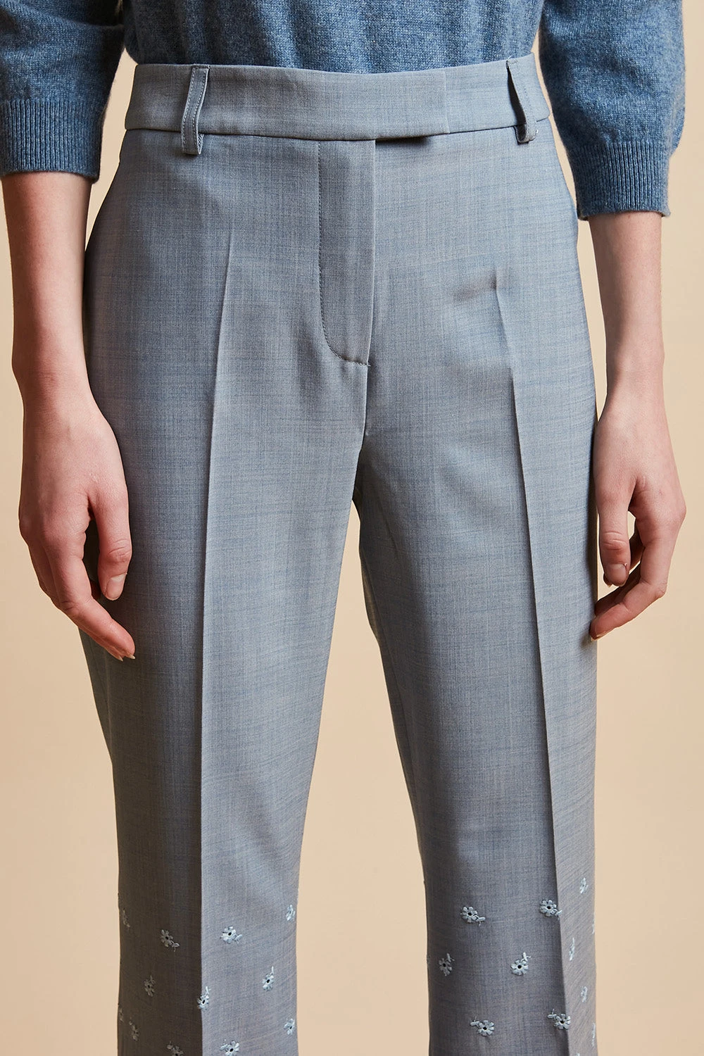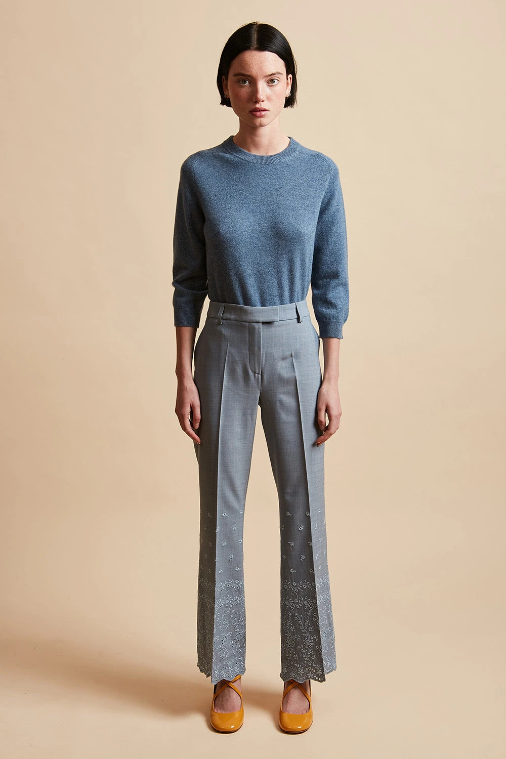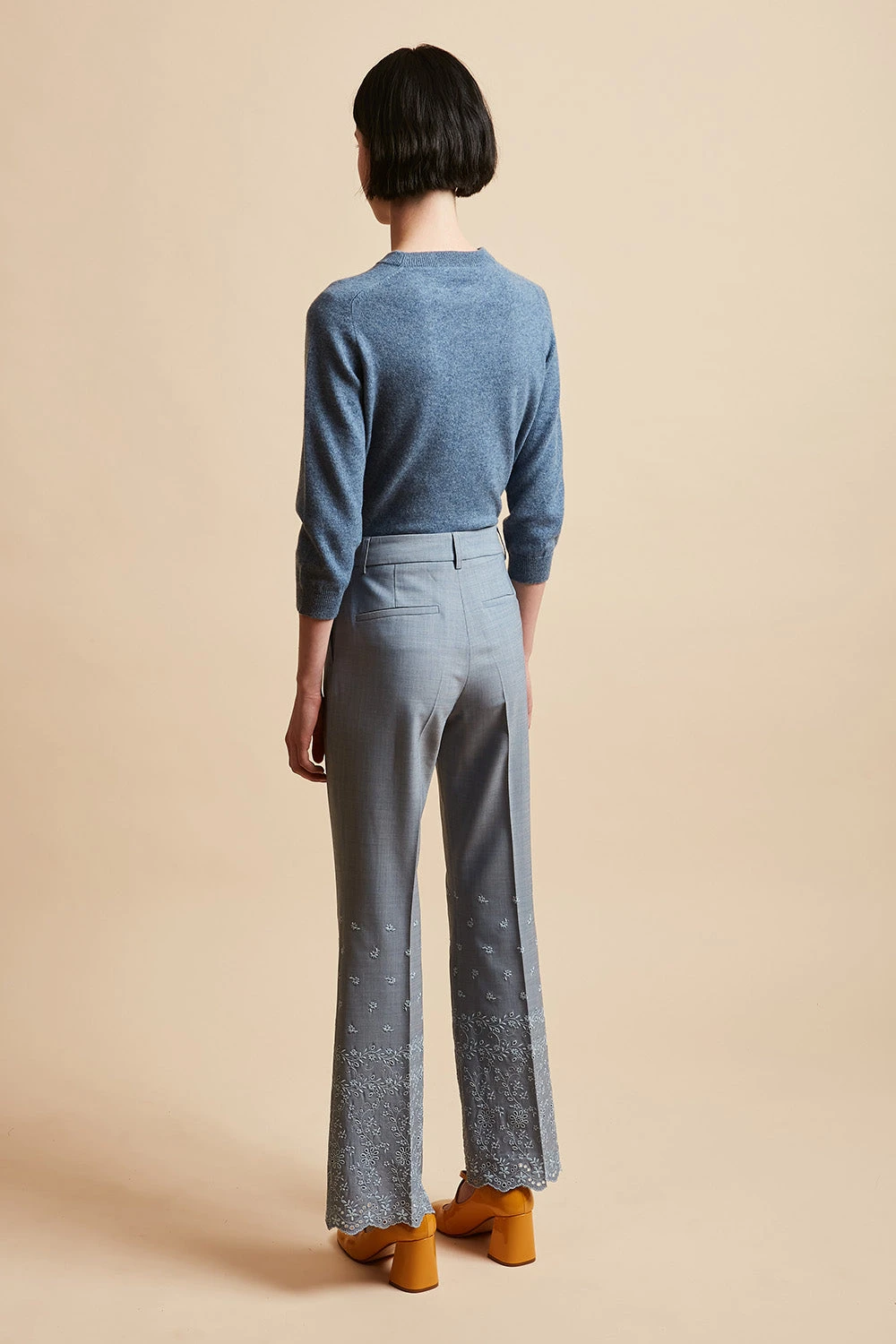 Succombez au broderies avec le pantalon en laine vierge tropicale JOVIAL. De longueur cheville, il dispose d’un bas évasé en broderie anglaise festonnée. Il est également doté d’une paire de poches italiennes à l’avant et d’une paire de poches passepoilées au dos. Des passants sont présents afin de pouvoir ajouter une ceinture. Un pli repassé figure sur les jambes.