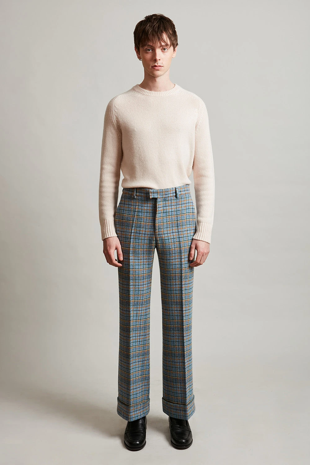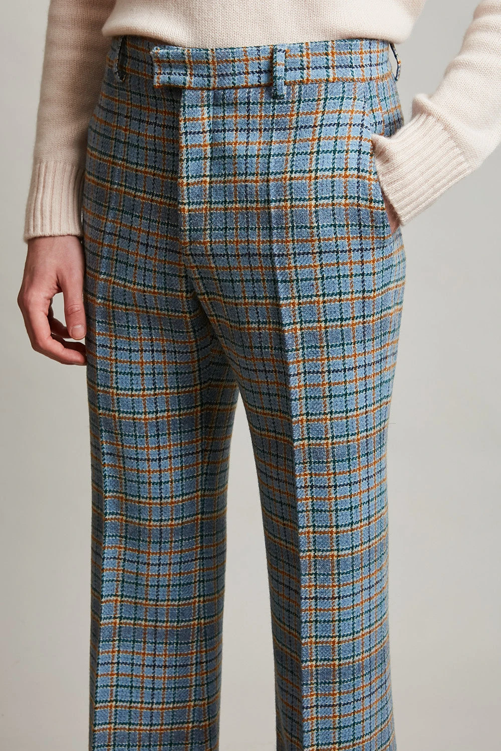 Succombez au motif tartan avec le pantalon flare à revers large ULYSSE tissé en France. Il dispose de plis marqués, d’une paire de poches italiennes à l’avant et d’une paire de poches passepoilées doubles fermées par un bouton yvette recouvert de tissu. Il est également doté de passants afin de pouvoir ajouter une ceinture.