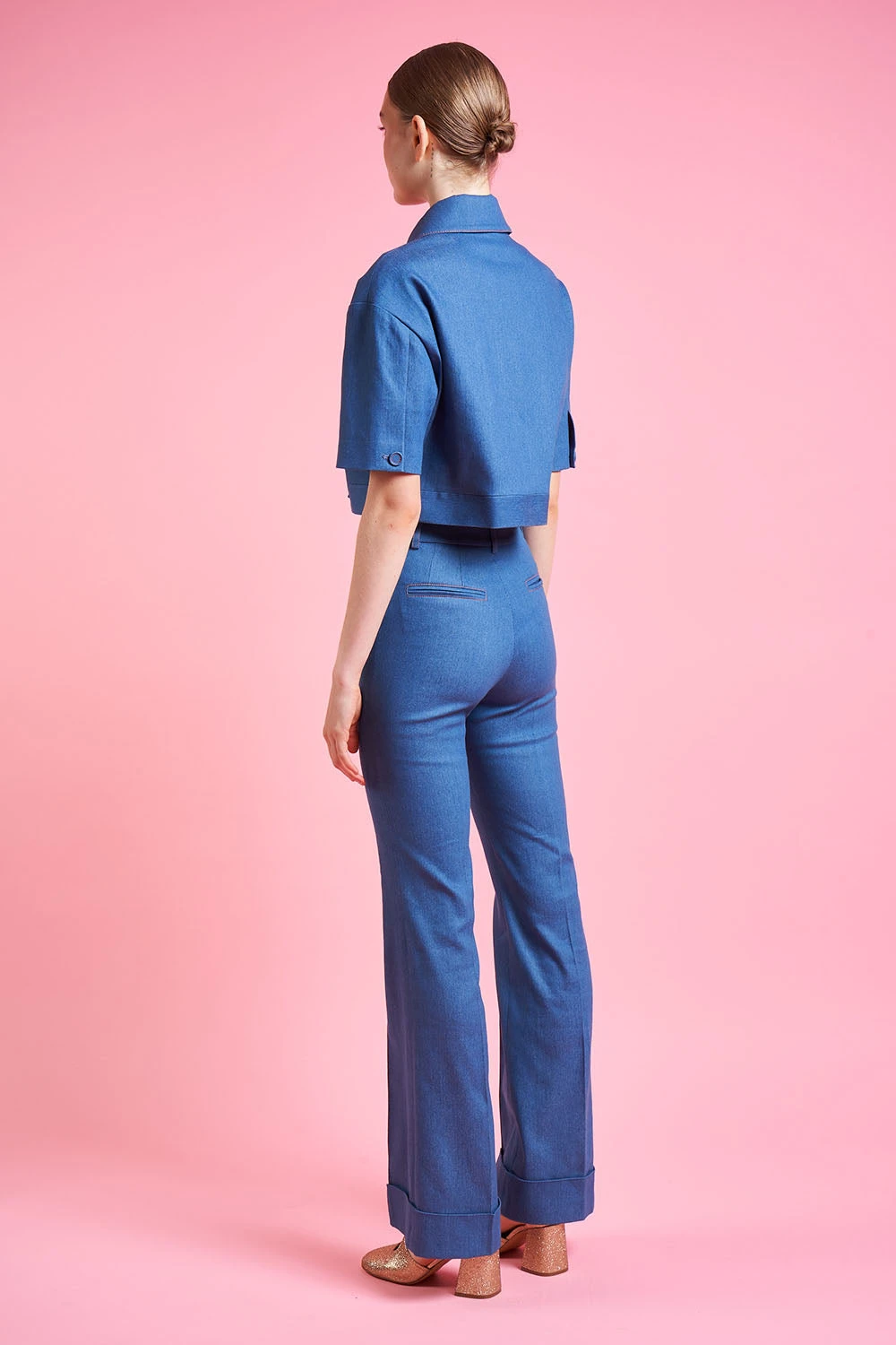 • Coupe taille haute près du corps et jambes évasées