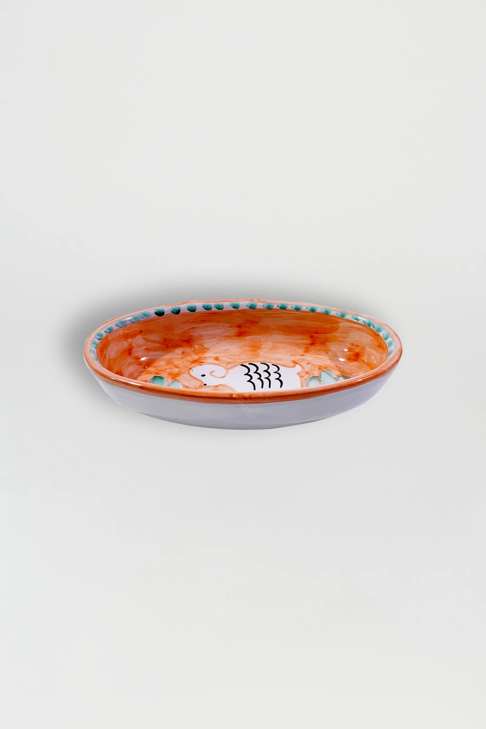 Plat oval en céramique de 18 cm avec motifs Moutons. Chaque pièce unique de céramique est fabriquée par des artisans italiens à Positano et décorée au pinceau sur la base de tons aquarellés et de thèmes bestiaires porte-bonheur.