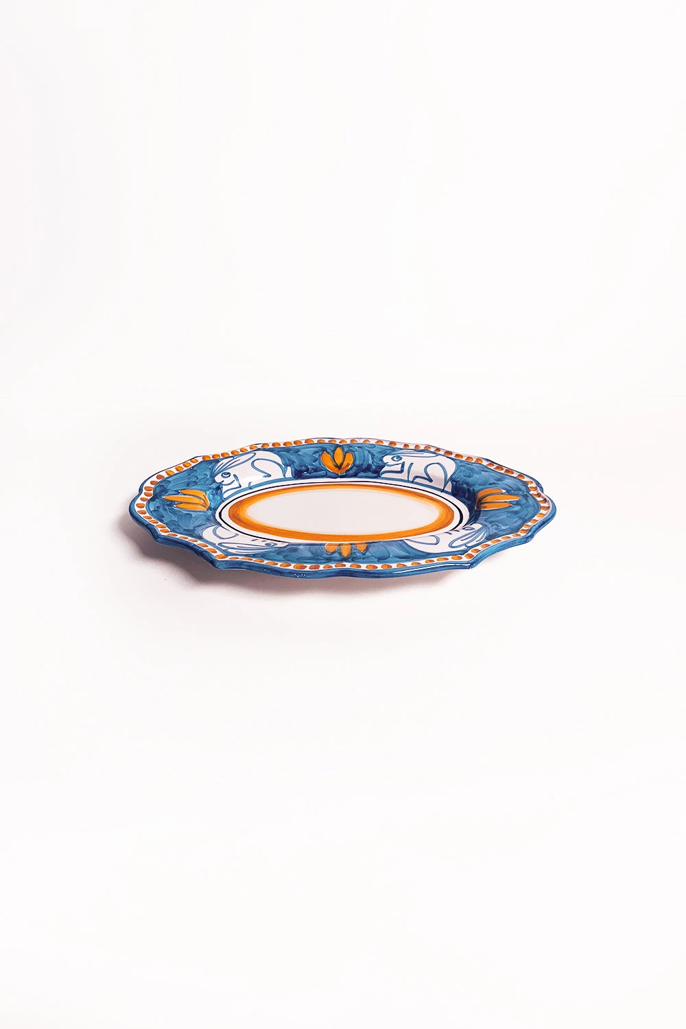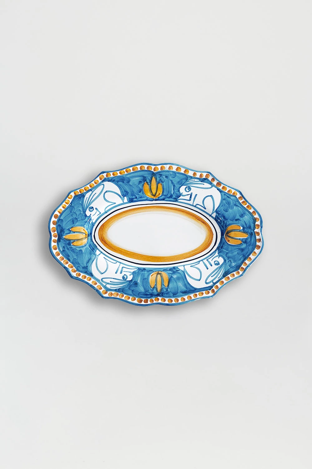 Plateau de service ovale en céramique avec motifs Lapins. Chaque pièce unique est fabriquée par des artisans italiens et décorée au pinceau sur la base de tons aquarellés et de thèmes bestiaires porte-bonheur.