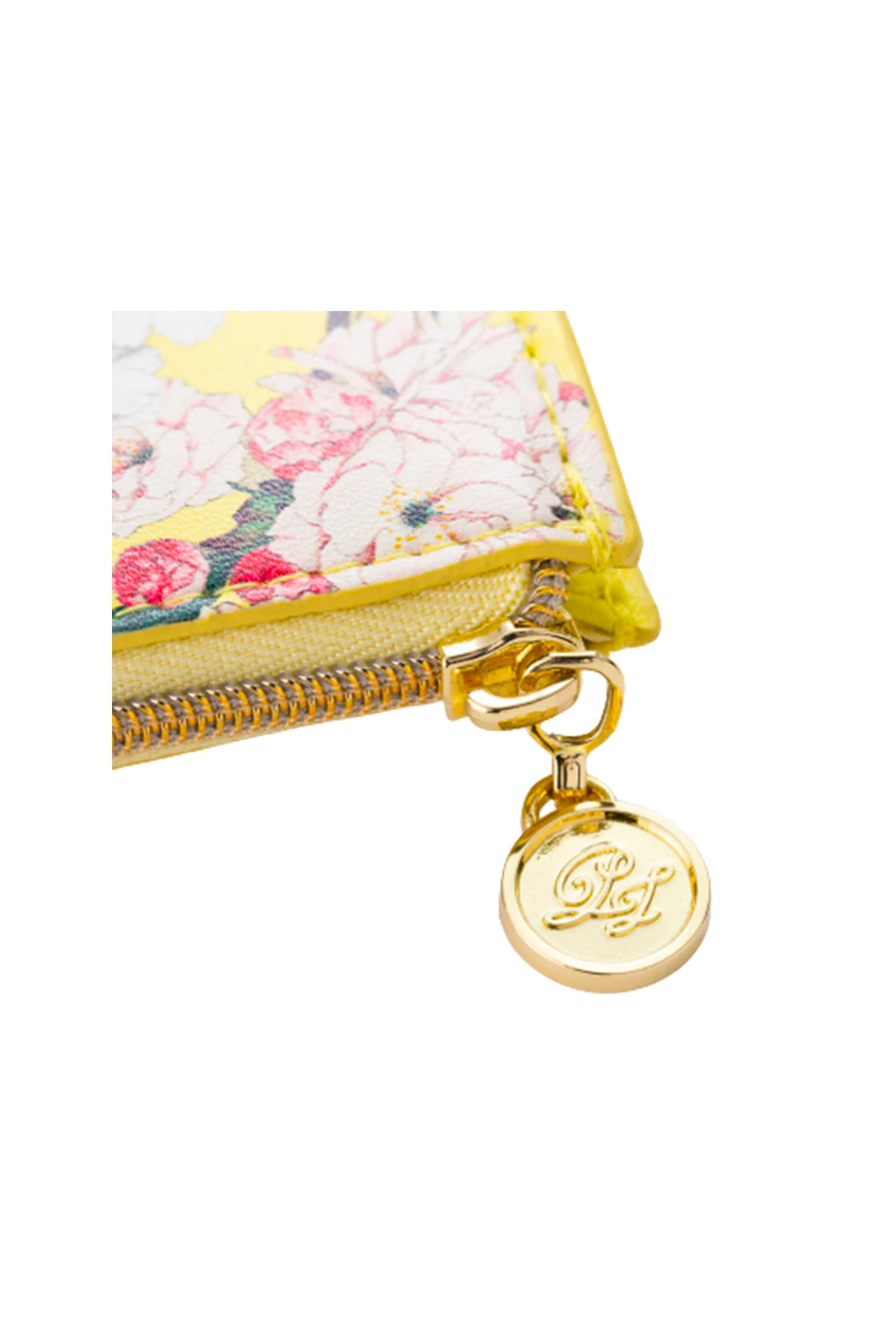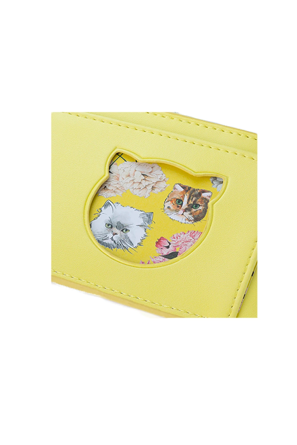 Porte-cartes en imitation cuir imprimé fleurs et Gipsy, le chat iconique de la marque. Emplacement externe en transparence par une découpe en forme de tête de chat.