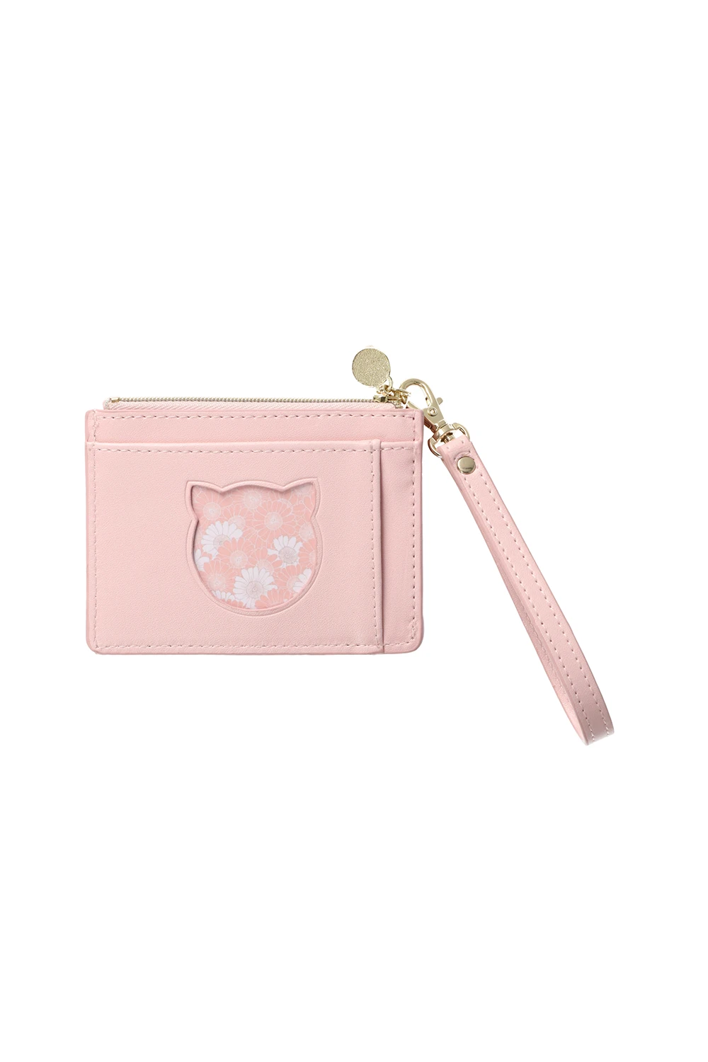 Porte-cartes en imitation cuir imprimé fleuri avec zip doré. Emplacement externe en transparence par une découpe en forme de tête de chat.