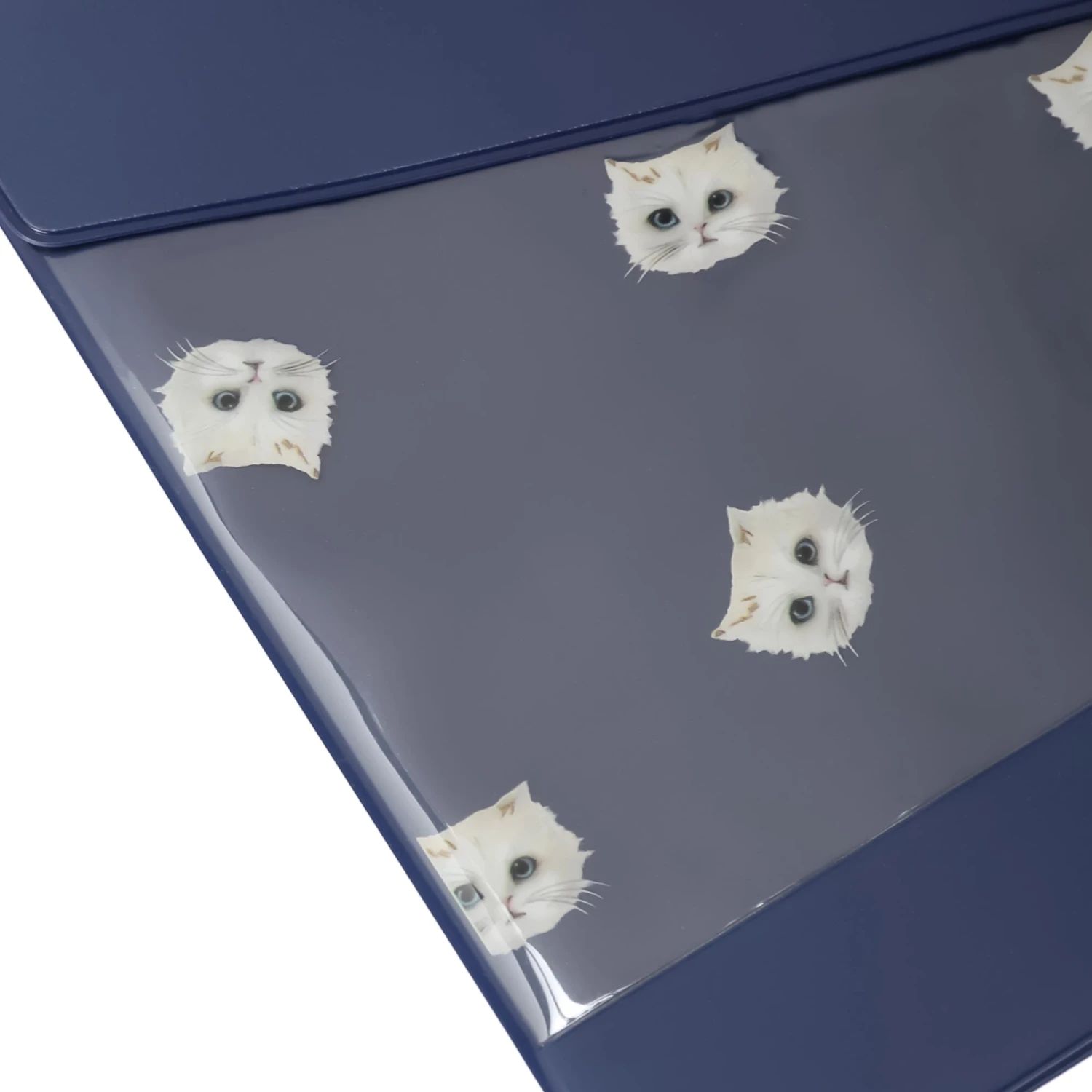 Cette pochette marine en PVC protègera tout vos carnets en format A5.Elle se ferme facilement grâce à un bouton pression à l’avant. Fondez pour son adorable imprimé à pois Gispy, l’un des chats de notre créatrice Sophie Mechaly.
