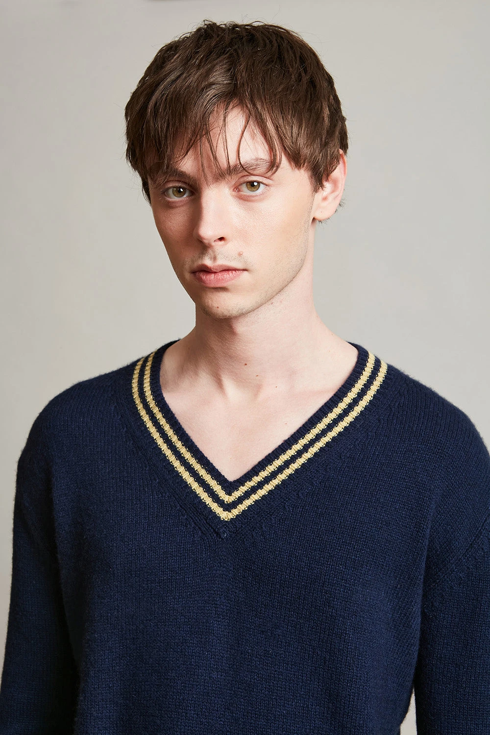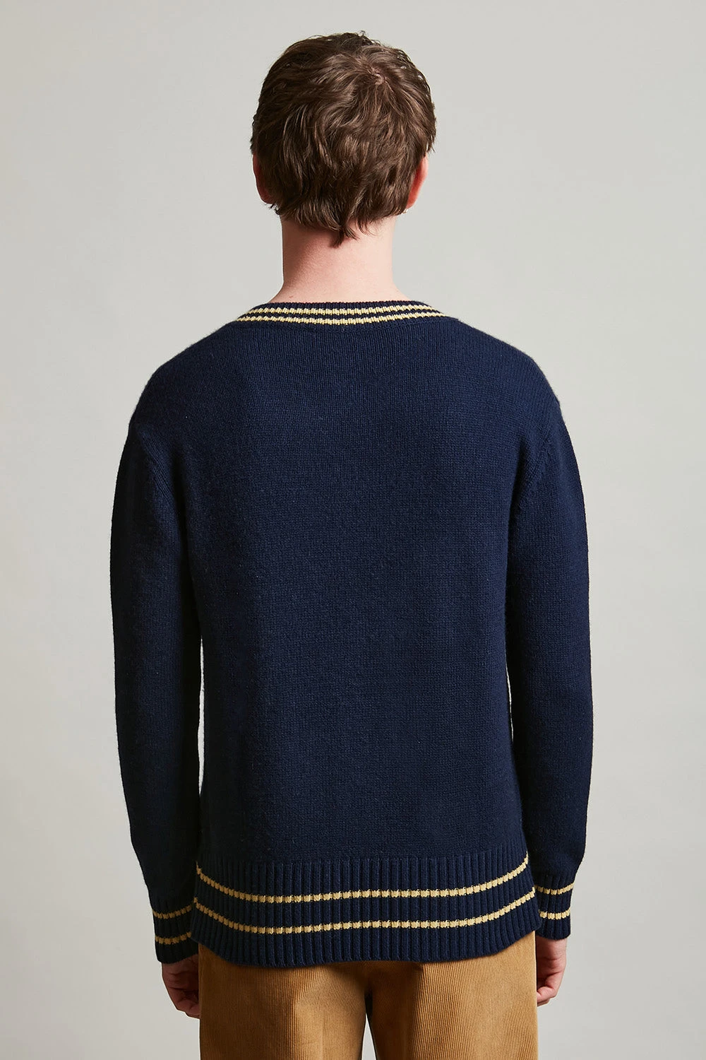 Complétez votre garde-robe avec le pull col V en maille et cachemire ROSS. De coupe ample, il dispose d’une broderie “Paul & Joe” en bas de pi!ce et d’une double rayure au niveau du col, du bas et des manches.