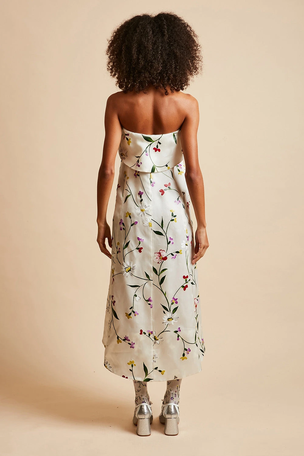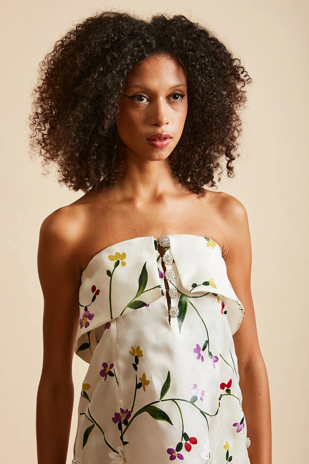 Succombez au motif floral avec la robe bustier longue en organza de soie imprimée all over URSULA. Elle est dotée d’un boutonnage à l’avant avec des boutons bijoux et de poches sur les côtés ornées également de boutons bijoux.