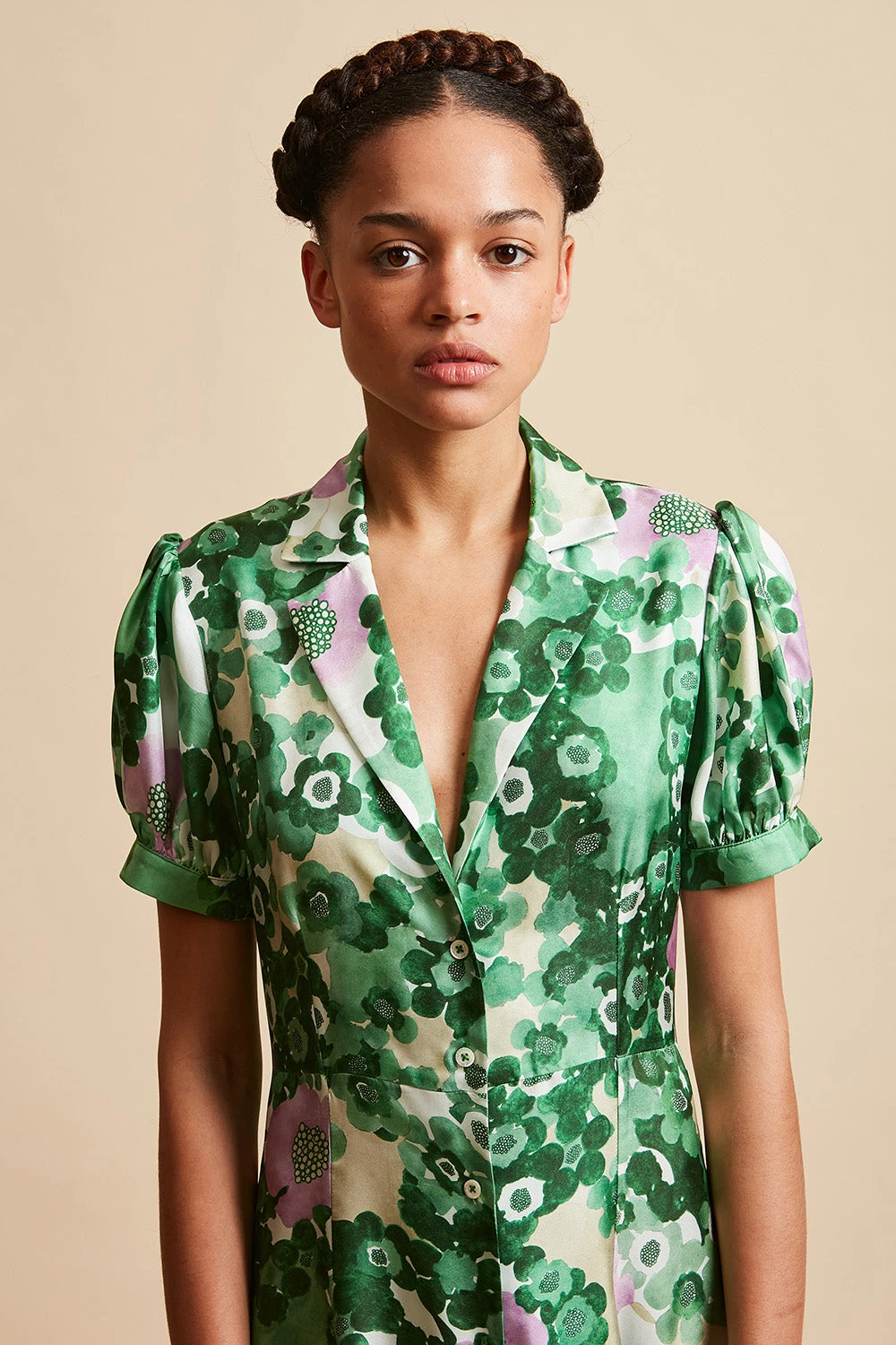 Tombez sous le charme de la robe chemisier longue LUCIA en twill de soie et de son motif floral all over. Elle est dotée d’un col bowling, de manches courtes ballon avec fronces, d’une découpe taille haute, d’un boutonnage avant tout le long. Le plus ? Un assemblage en couture anglaise.