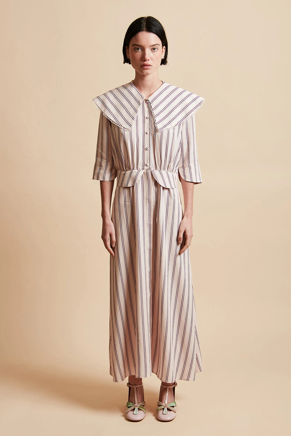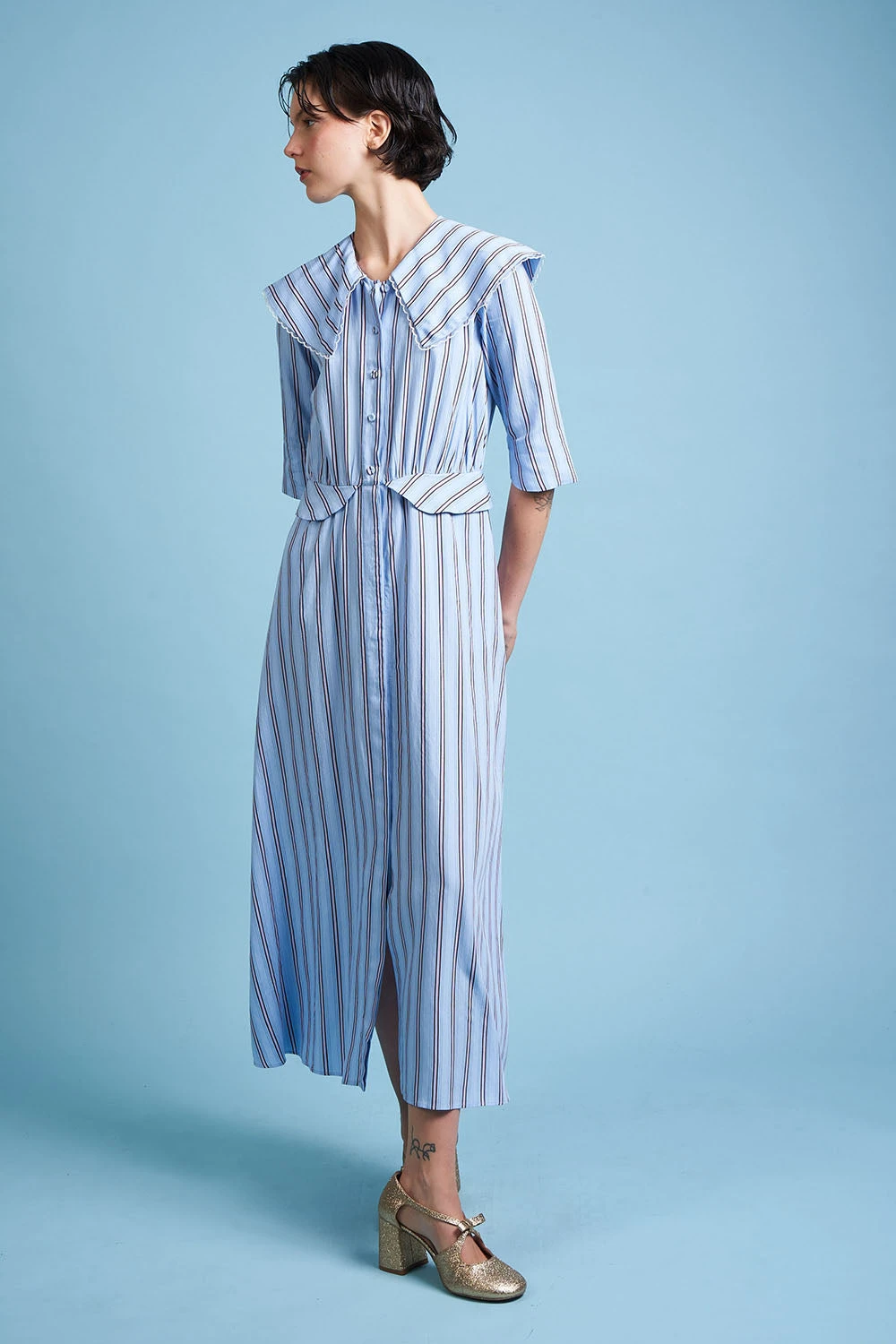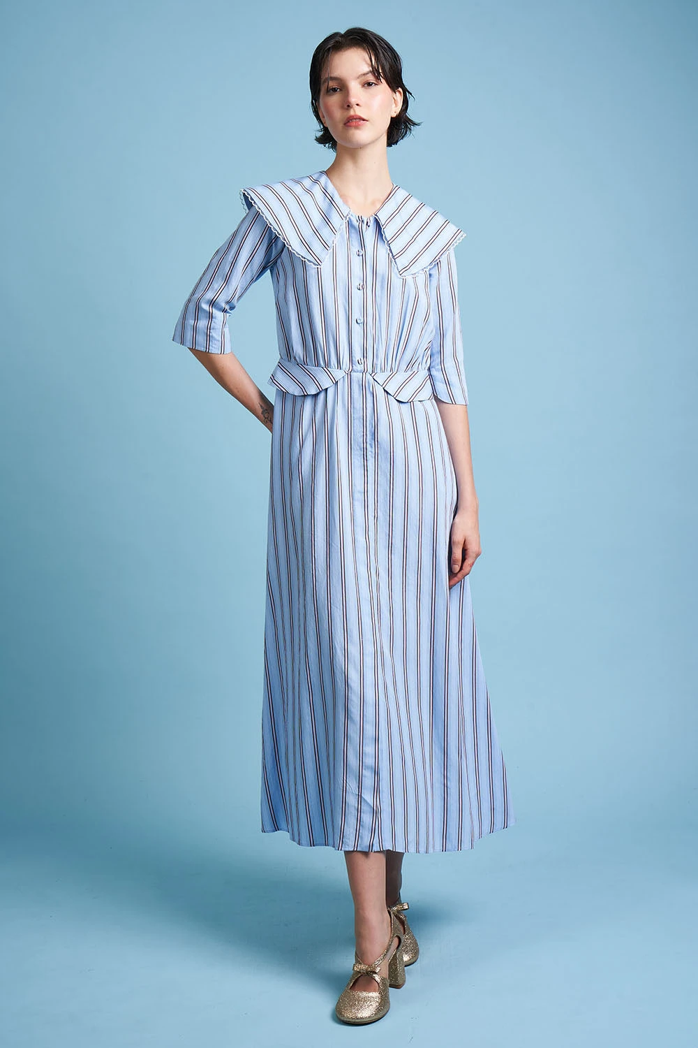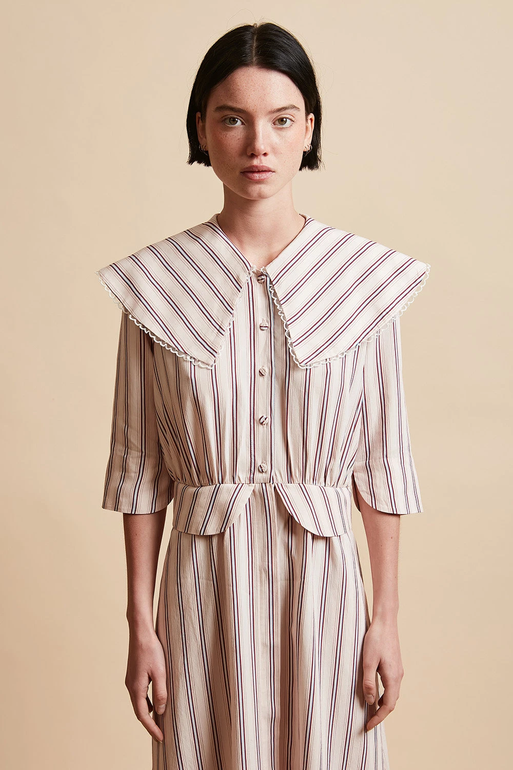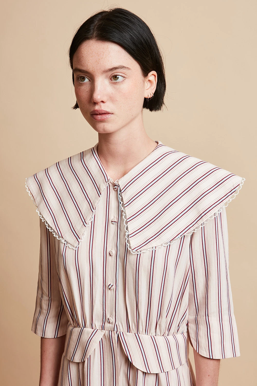 Succombez aux rayures avec la robe chemisier en viscose et soie MISSOURI. De longueur midi, elle dispose d’un grand col orné d’un feston de dentelle et de manches 3/4. La jupe est froncée à la taille et cette dernière est soulignée par une basque prise en couture à la taille ce qui vous mettra en valeur. Le corsage est également froncé.