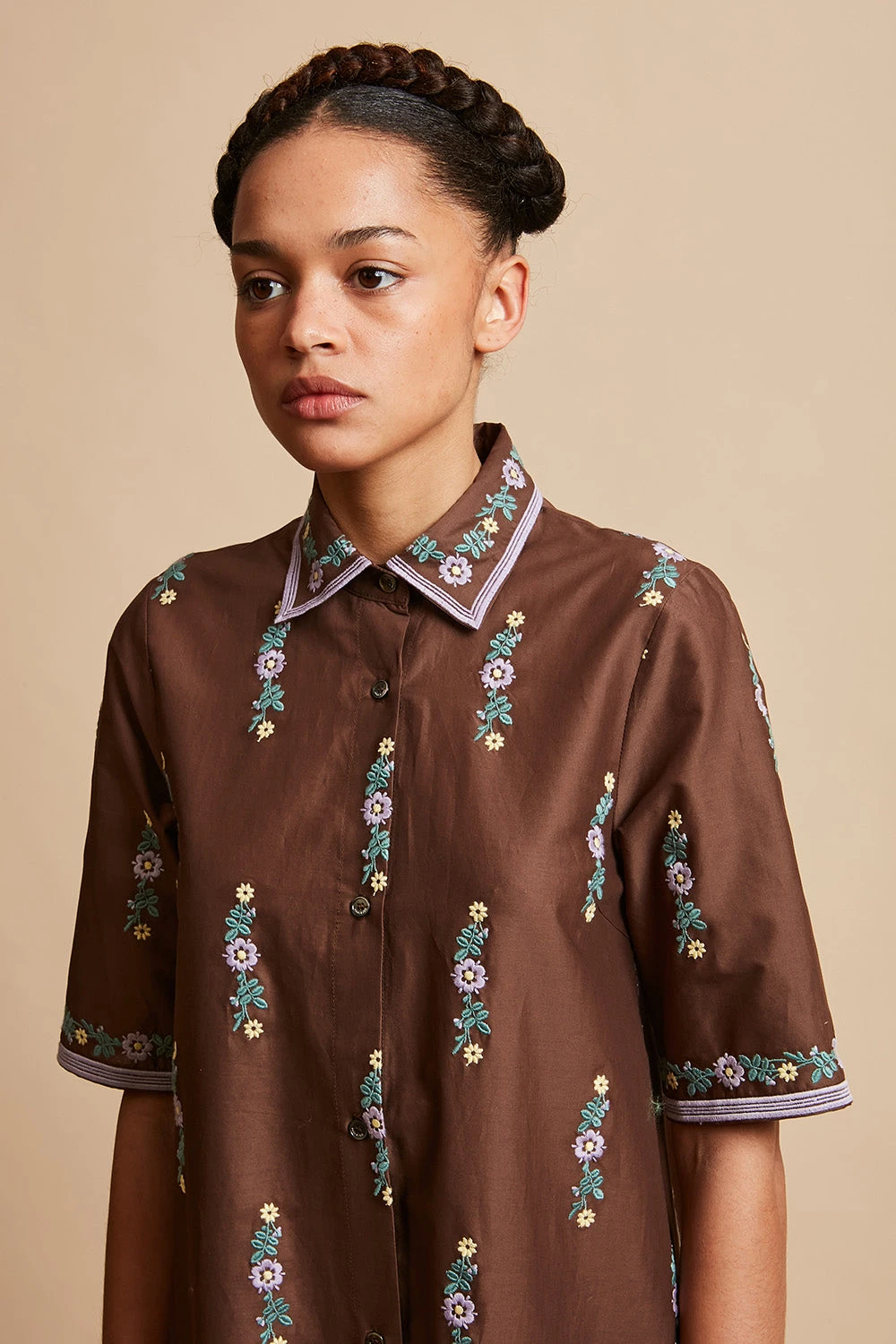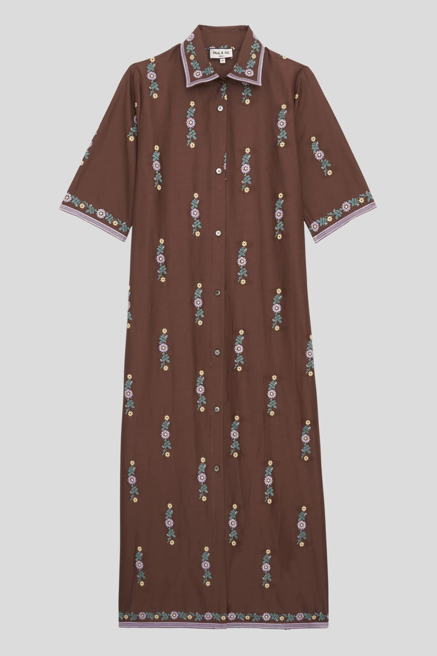 Succombez pour la robe chemisier midi MARELLE en batiste de coton bordé. De tissu français, elle dispose de broderies à motif floral. Elle est dotée d’un col chemisier pied de col boutonné, de manches longueur coude, et de poches dans les coutures.