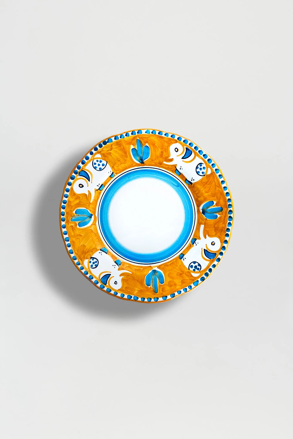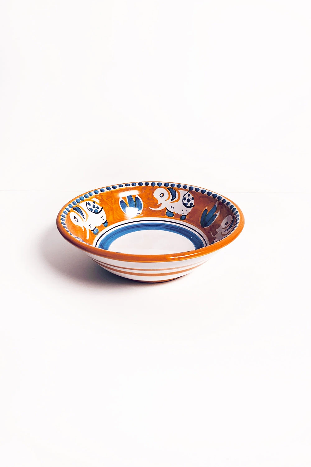 Saladier en céramique de 26 cm avec motifs Éléphants. Chaque pièce unique est fabriquée par des artisans italiens et décorée au pinceau sur la base de tons aquarellés et de thèmes bestiaires porte-bonheur.