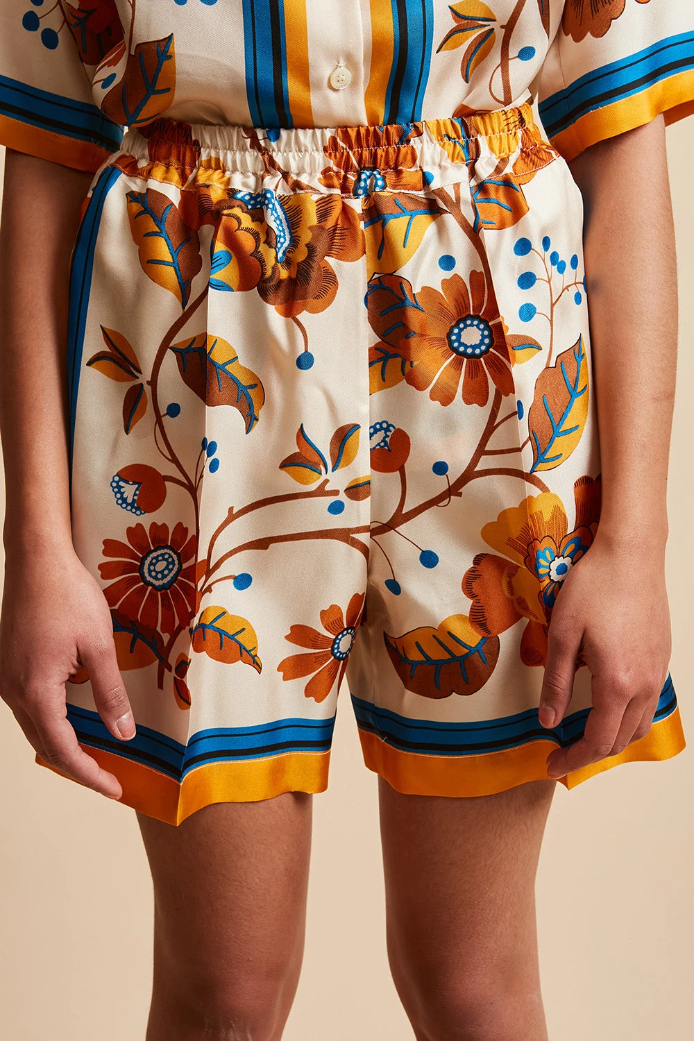 Succombez pour le short court CASSIUS, en twill de soie imprimé. Il est doté d’un imprimé floral et est élastiqué à la taille.