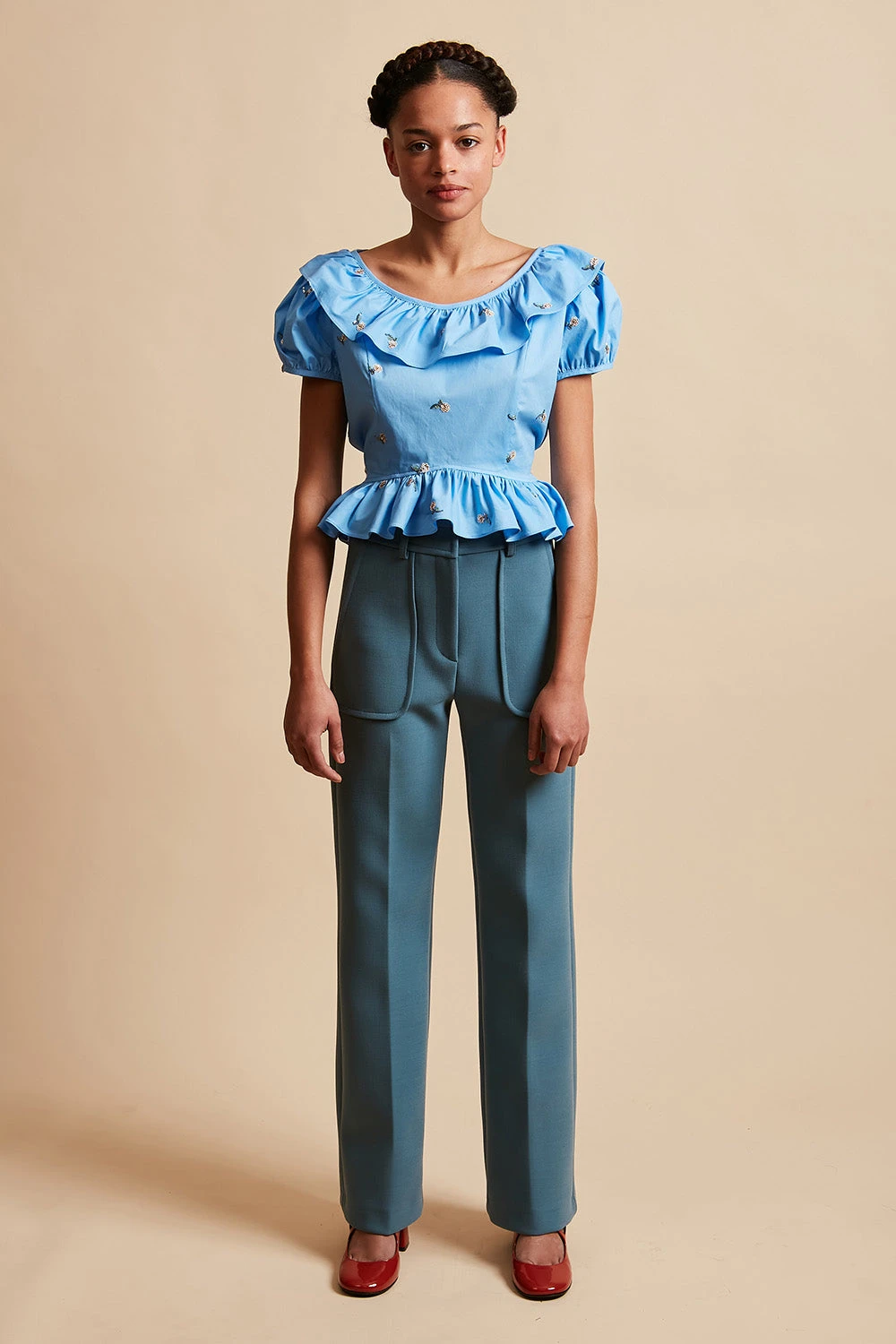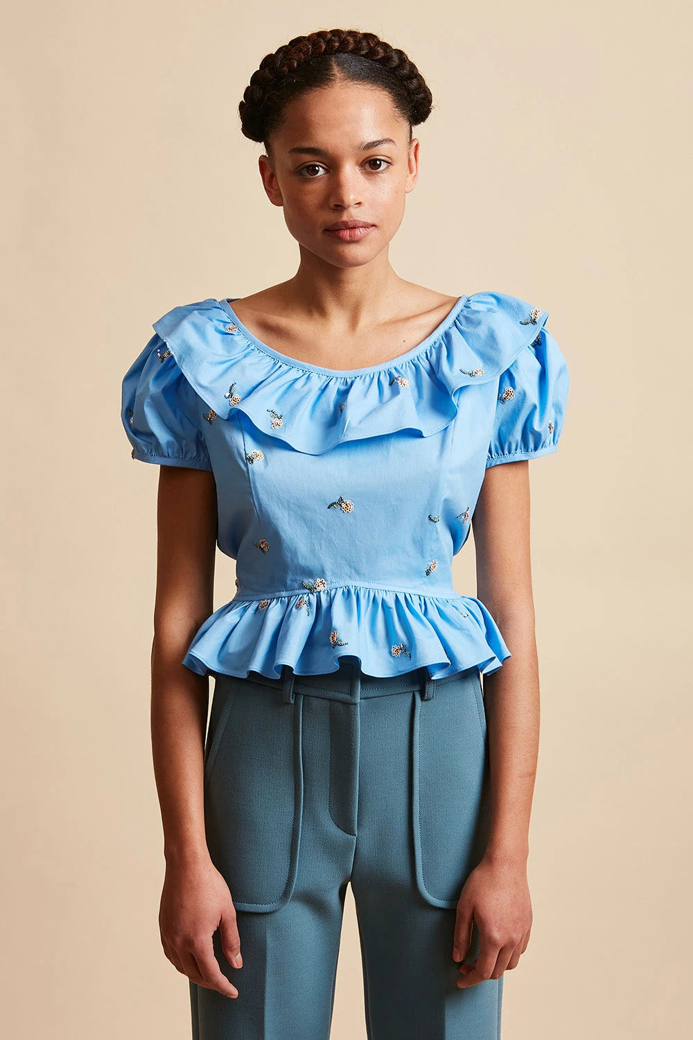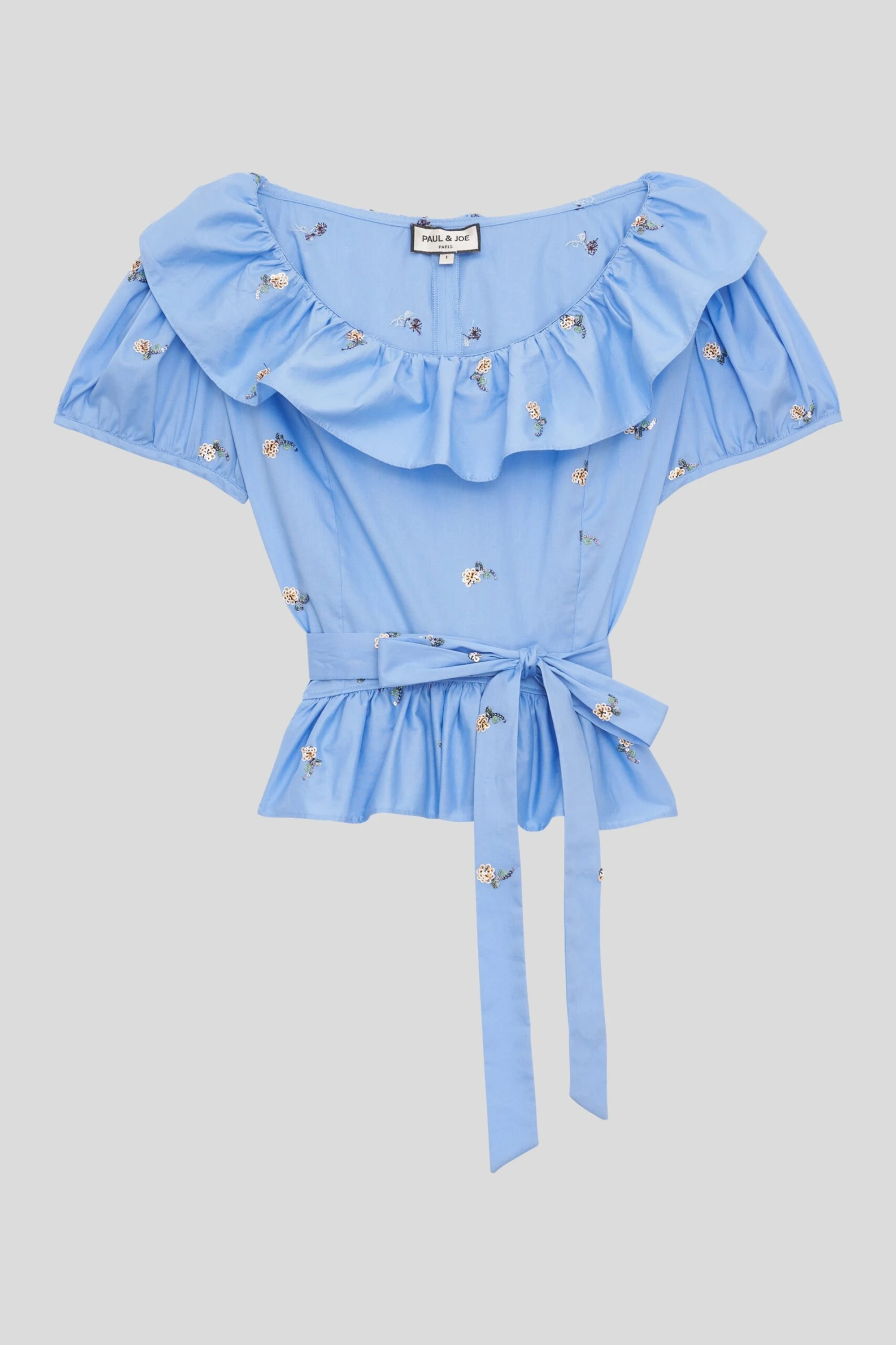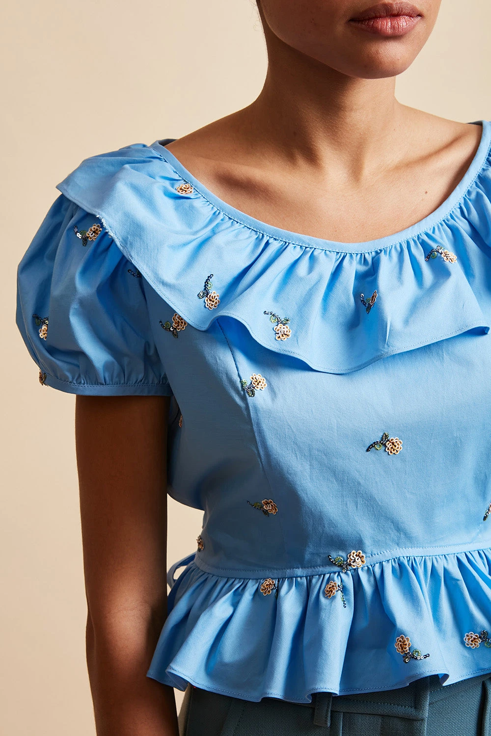 CUDJOE est un top court en popeline de coton brodé de petites fleurs en sequins, tissé en Italie. Son encolure est dégagée avec un volant froncé et brodé. Il dispose d’un dos corsage avec une paire de pince, un zip,. Il est également doté de 2 liens fixés aux cotés et noués dans le dos. Son charme tient aussi à ses jolies manches courtes ballon.