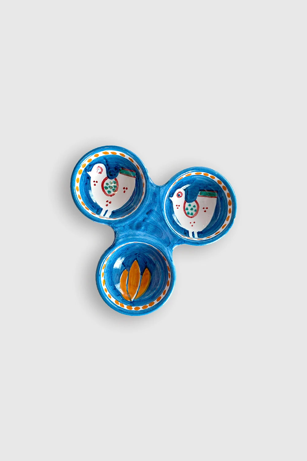 Trio de bols à tapas avec motifs Poules. Chaque pièce unique de céramique est fabriquée par des artisans italiens à Positano et décorée au pinceau sur la base de tons aquarellés et de thèmes bestiaires porte-bonheur.