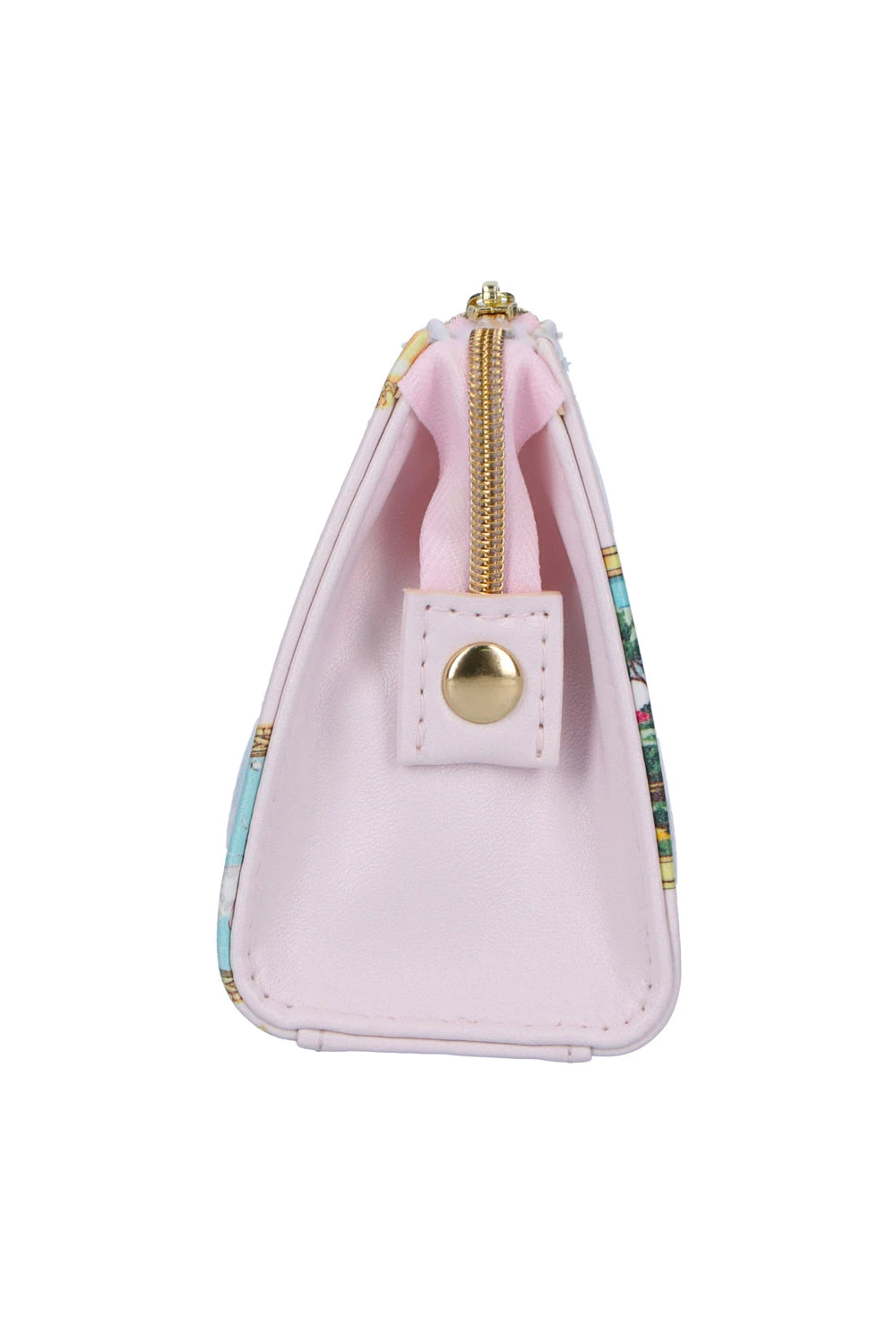Trousse imitation cuir rose à motifs médaillons avec un zip doré et charm. Avec sa forme triangulaire cette trousse mélange chic et délicatesse, vous pourrez facilement y ranger tout type de fournitures.