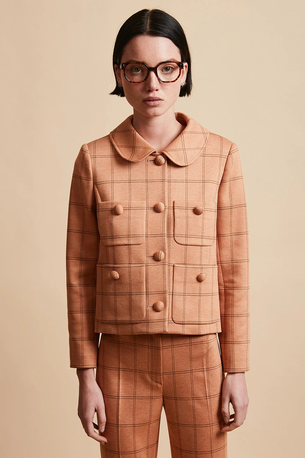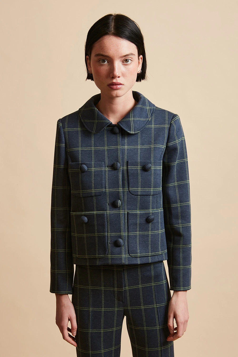 Succombez au motif jacquard avec la veste courte en jersey LILUNE. Elle dispose de boutons “boules” recouverts de tissu, de deux paires de poches et d’un col arrondi. Elle est également dotée de manches tailleur longueur 7/8 ème boutonnés en bas de manches par trois boutons “boules” recouverts. La veste est doublée.